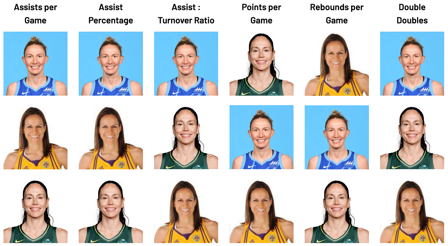 Seems like her case as the best Forward ever should be easy to make. But it gets tough when you consider the competition: Sheryl Swoopes, Tina Thompson, Tamika Catchings, Lauren Jackson, Swin Cash, Angel McCoughtry, Maya Moore, Nneka Ogwumike, and Candace Parker all played most of their career at Forward. Today’s best players (Breanna Stewart, A’ja Wilson, Napheesa Collier, and Alyssa Thomas) are also all Forwards. Arguing for the best Forward of all time is essentially arguing for the best player of all time.