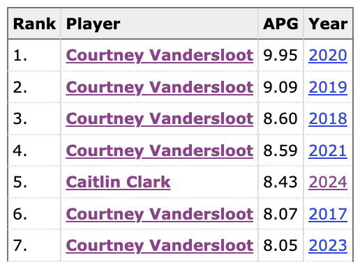 Yes. Sloot is second only to Sue Bird in career assists, but Bird played 150 more games. Looking at assists per game, Vandersloot is tops, averaging 6.6 dimes, 0.7 more than second place Sabrina Ionescu. That’s an extra 1.6 points per game3 over the second-best option ever.