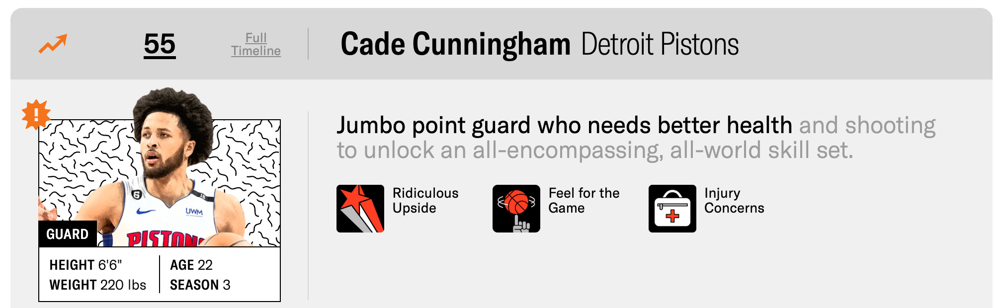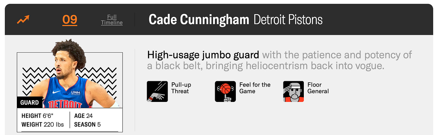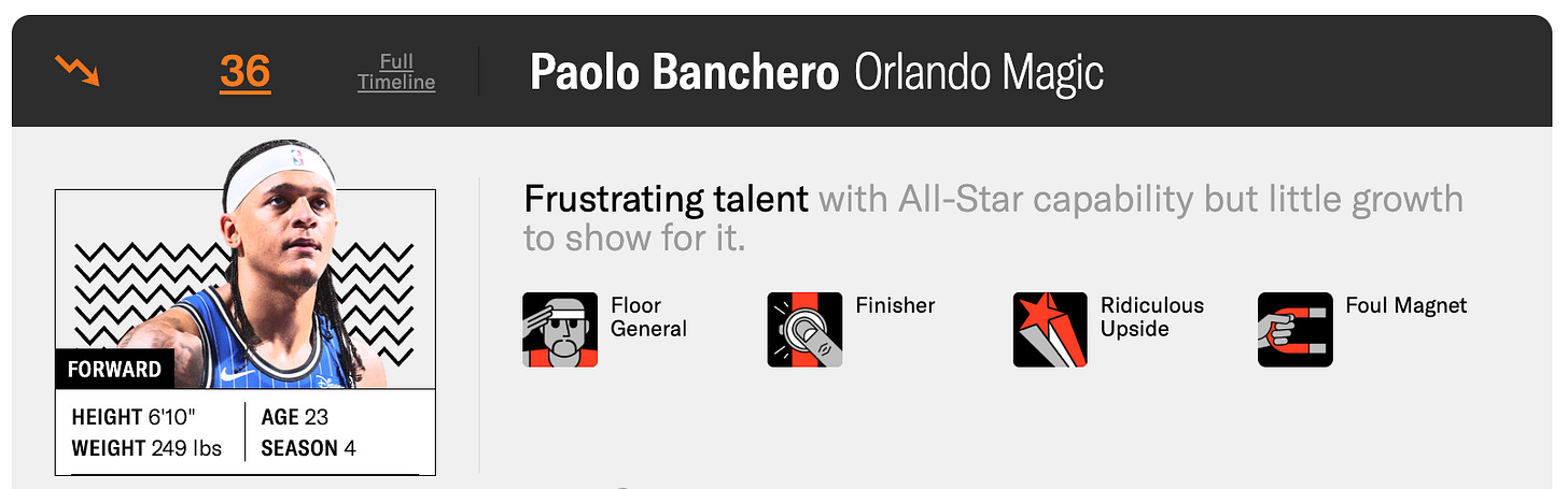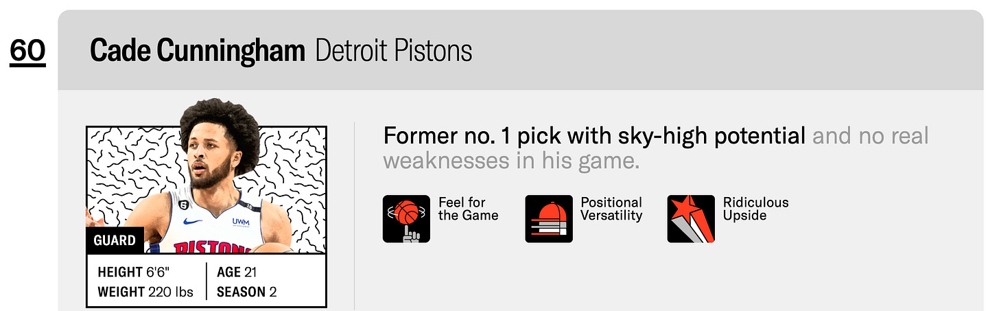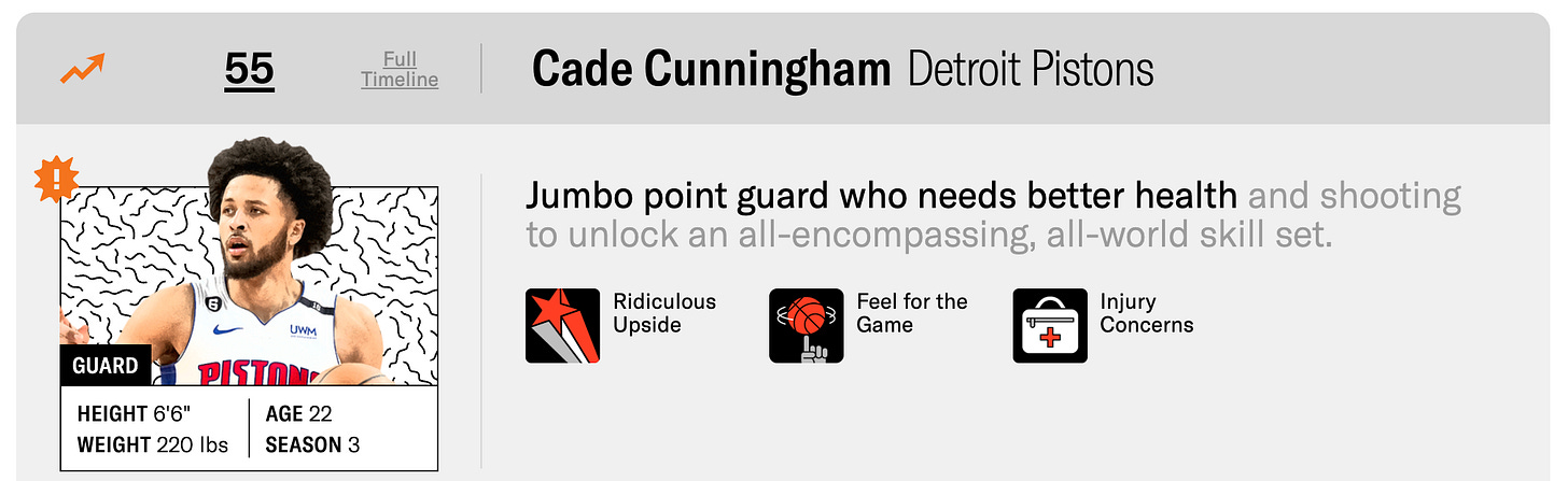 Cade is now in the Ringer’s top 10, while Paolo has fallen to 36th in the latest iteration, still with that “Ridiculous Upside” icon but now a “frustrating” label as well.