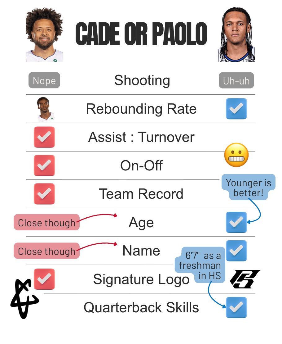 At first glance, Cade’s and Paolo’s blobs seem similarly shaped - sort of a deformed lower case t. They do have commonalities (elite scoring, high usage, etc.), but the slight differences between the two make all the difference,15 which you can see by comparing the colors to the light gray backgrounds on each radar. Paolo is a better rebounder and gets to the line more, while Cade is a better passer, free throw shooter, and defender.
