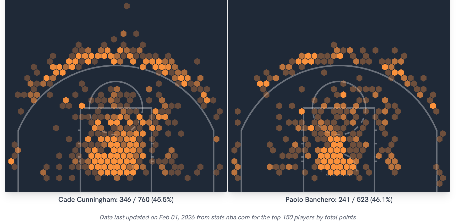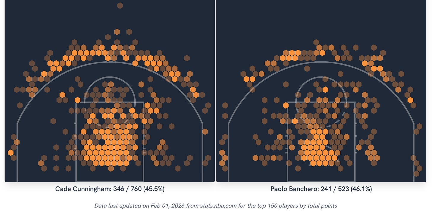 Still, Paolo and Cade are shooting about the same percentages. While both could be better, it doesn’t explain the divergence. What does explain the four-point difference in scoring this season, after they tracked so closely together previously, is simply volume: Paolo is taking four fewer field goal attempts per game than Cade (and than Paolo took last year). Even with an All-Star teammate for the first time, Cade is still the go-to option on the Pistons; Paolo may not be.