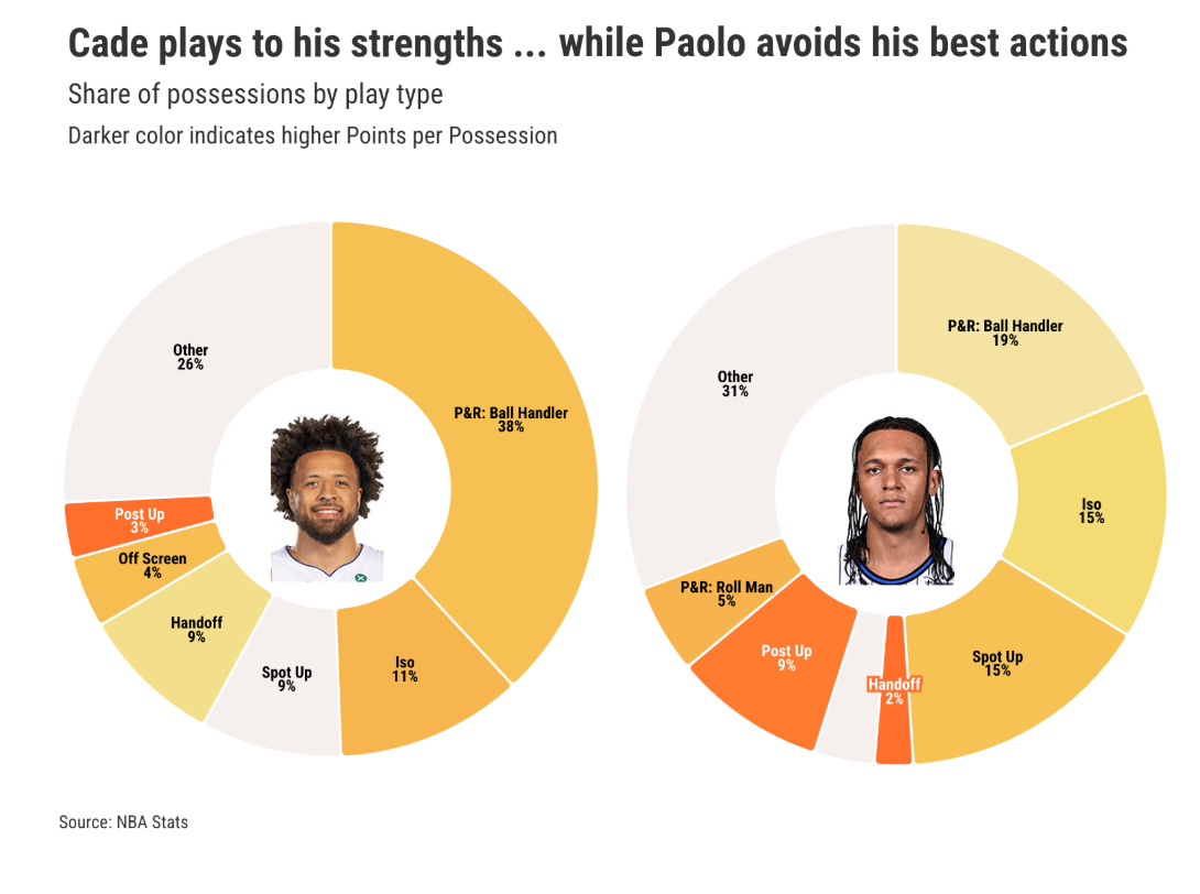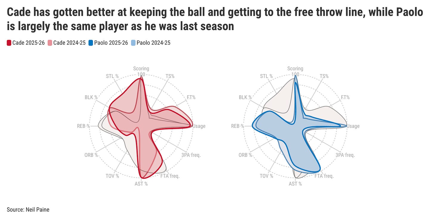 So Cade is still not a great shooter, but he has greatly improved the other aspects of his game, that final 10% that fans and critics alike have been hoping he would fix. Meanwhile, Paolo is largely the same player, even while taking a slight step back in usage. That is the difference in these two players’ trajectories this season.