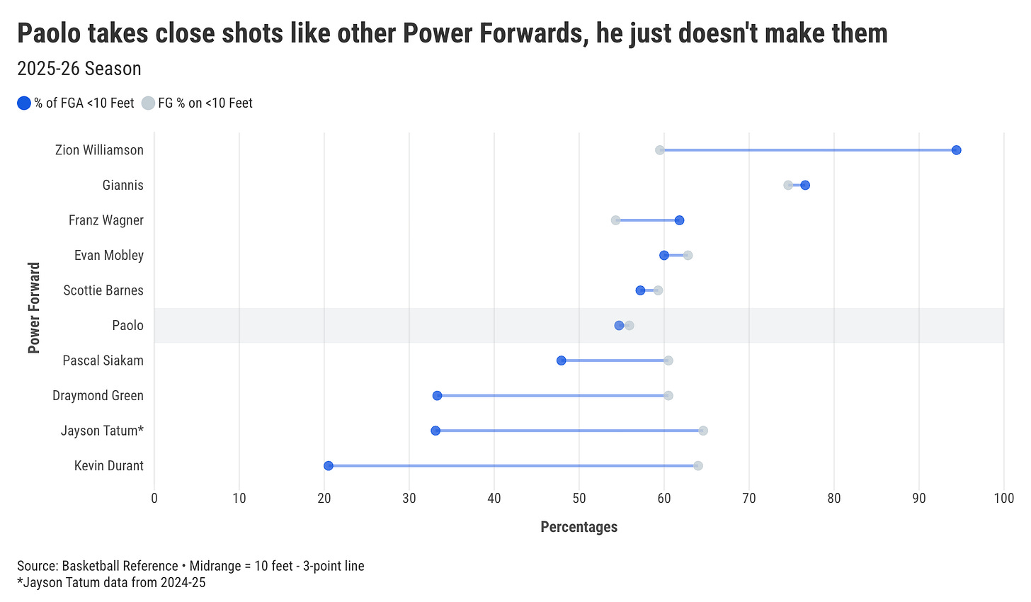 Sure that’s still less than Dwight Howard, who at Paolo’s build took over 90% of his shots from within 10 feet,14 but Dwight played in a different era (and was an even worse shooter). Among today’s best Power Forwards, Paolo gets to short shots at about average rates.