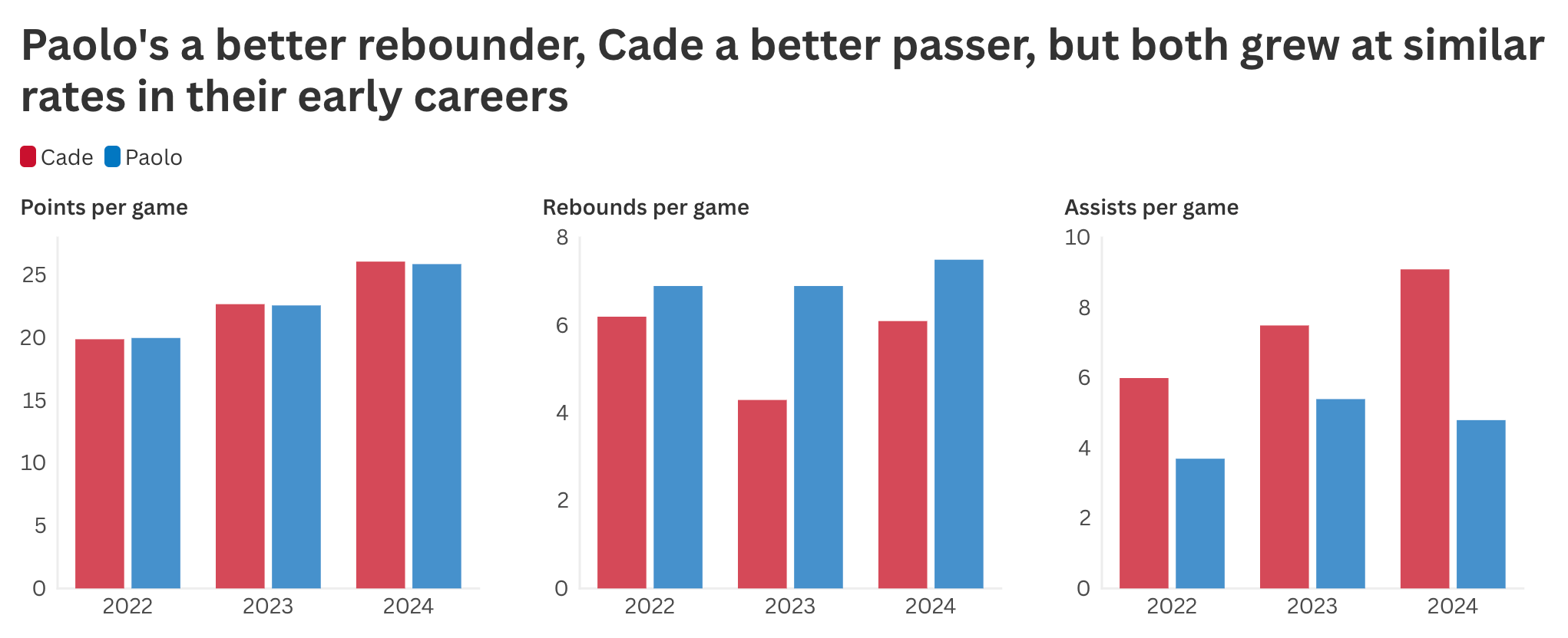 Paolo and Cade are both “do it all” players,7 but Paolo, with his Dwight Howard frame, has always been the better rebounder, and Cade the better passer. In addition to the step ups in scoring, we can see each player improving in their respective domains season after season in the middle and right charts above.
