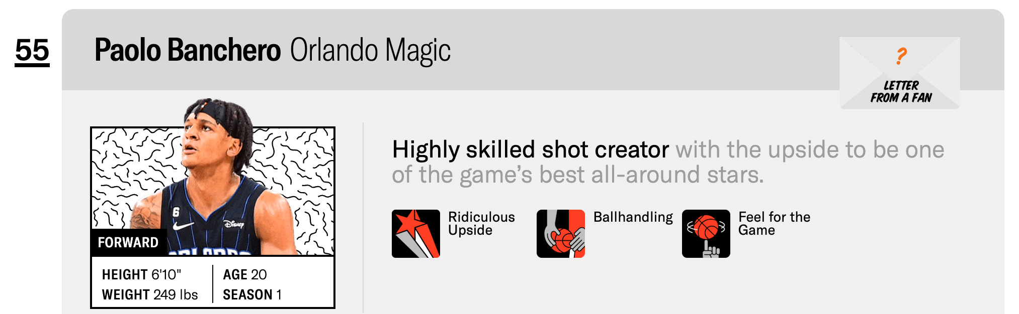 The Power Forward overlap is the sharpest team-building question in Orlando. Paolo and Franz are the same size, with largely the same skillset, which makes them essentially interchangeable. It’s easier for defenses to scheme against and risks falling into a my-turn-your-turn offense. The answer may be trading one of the two, even if that means the once-savior of the franchise gets shipped away.
