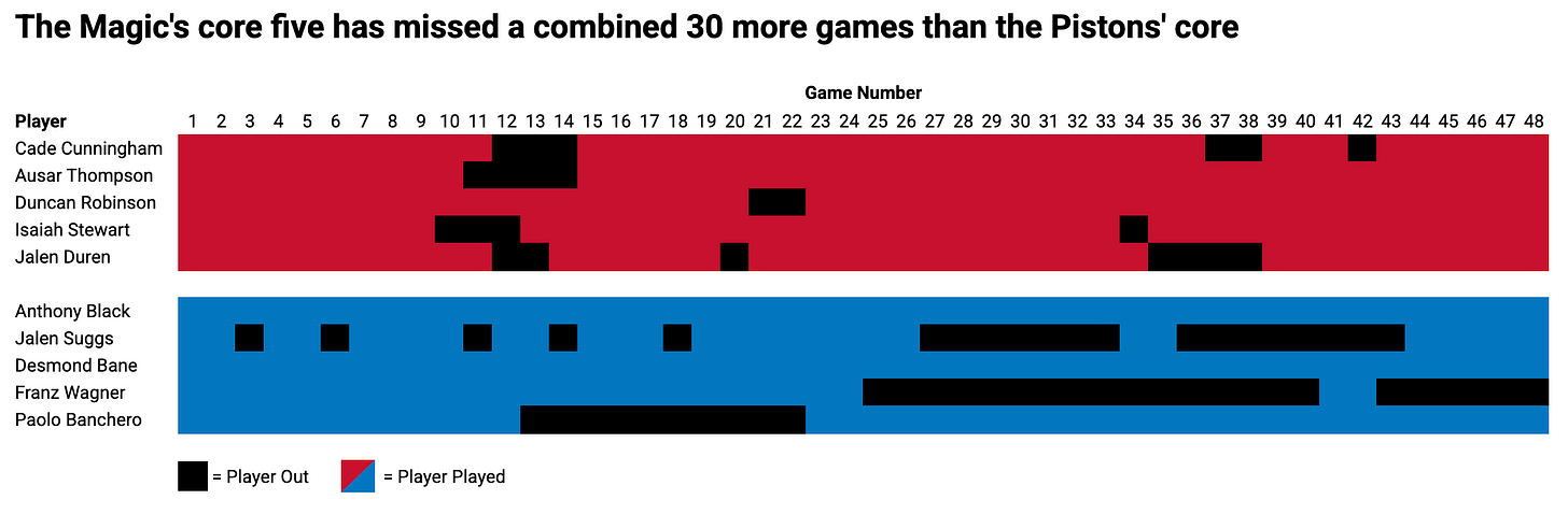Ah injuries, the easiest excuse to lean on, but one that is often actually impactful11 for explaining team and player performance across sports. Cade has been healthy this season, Paolo has not. The Pistons have been healthy this season, the Magic have not.