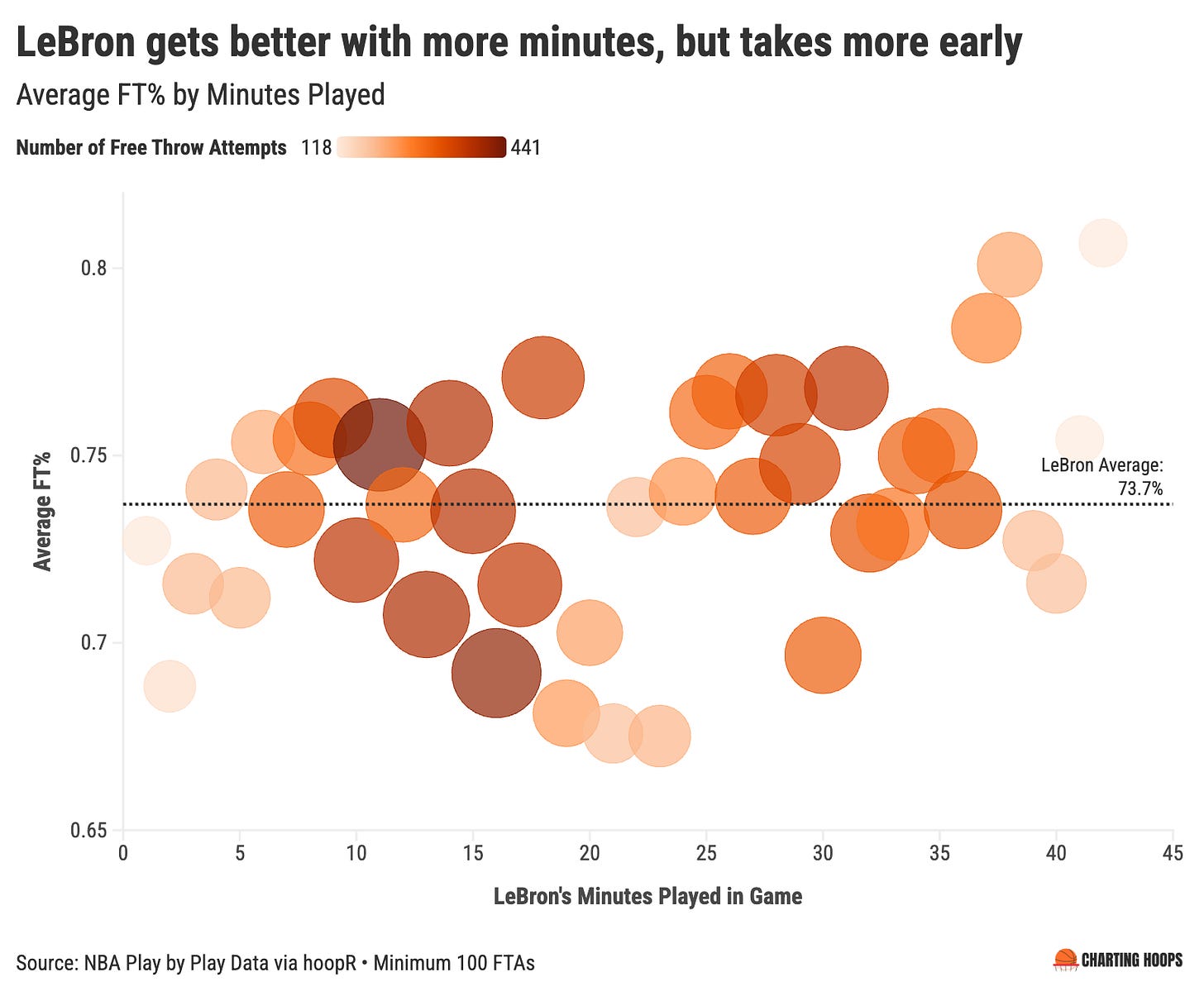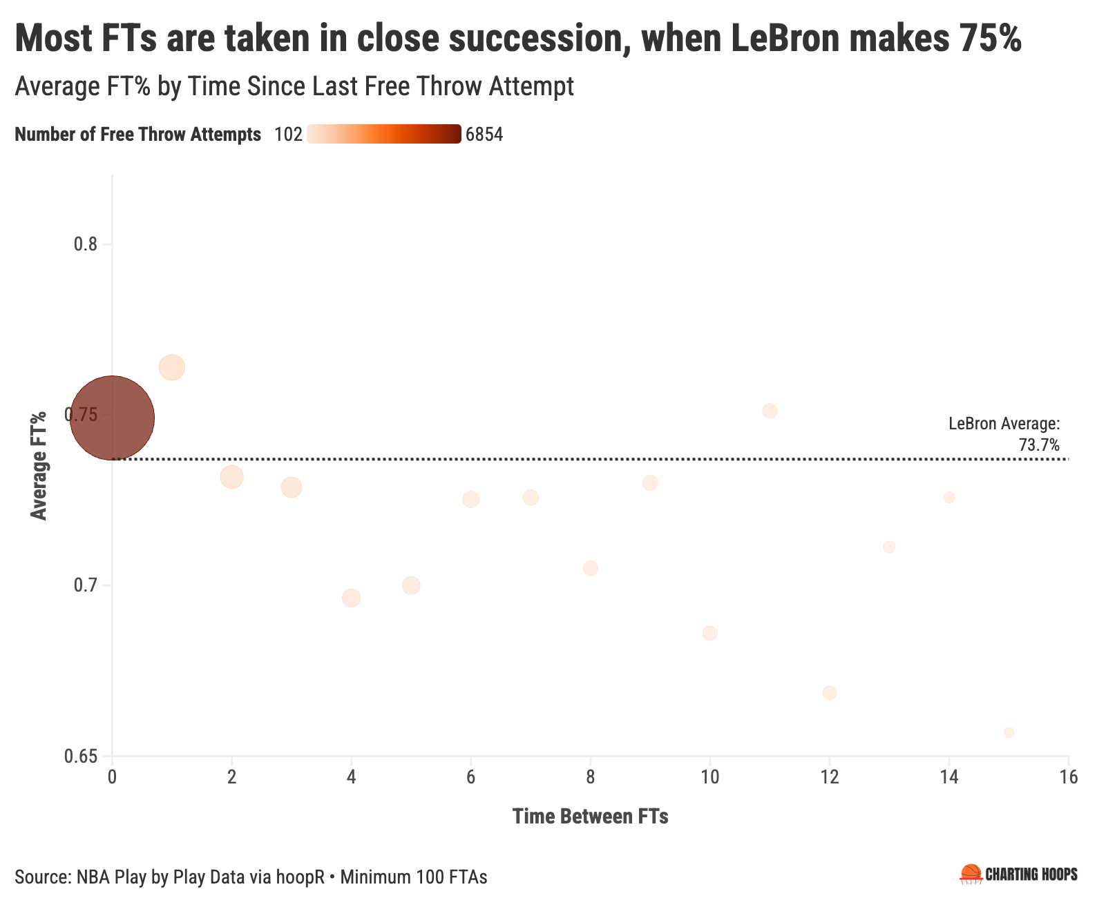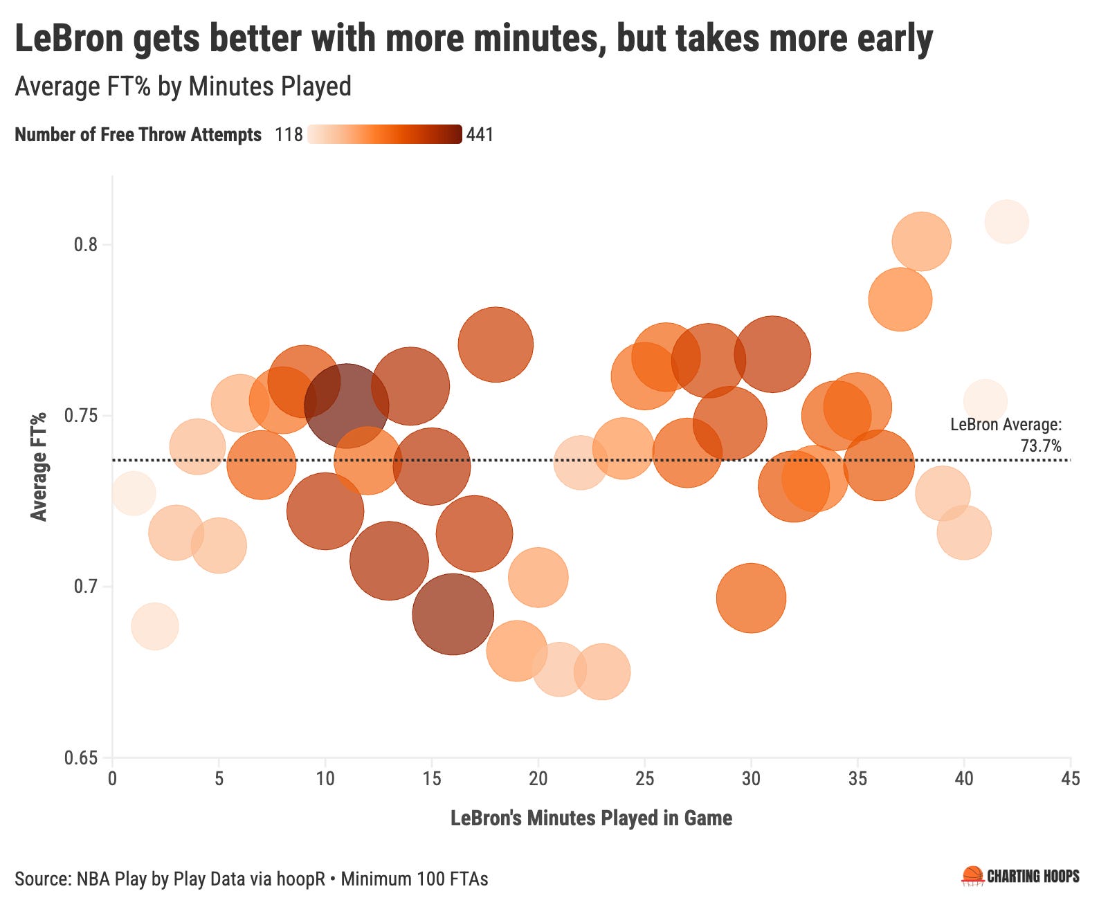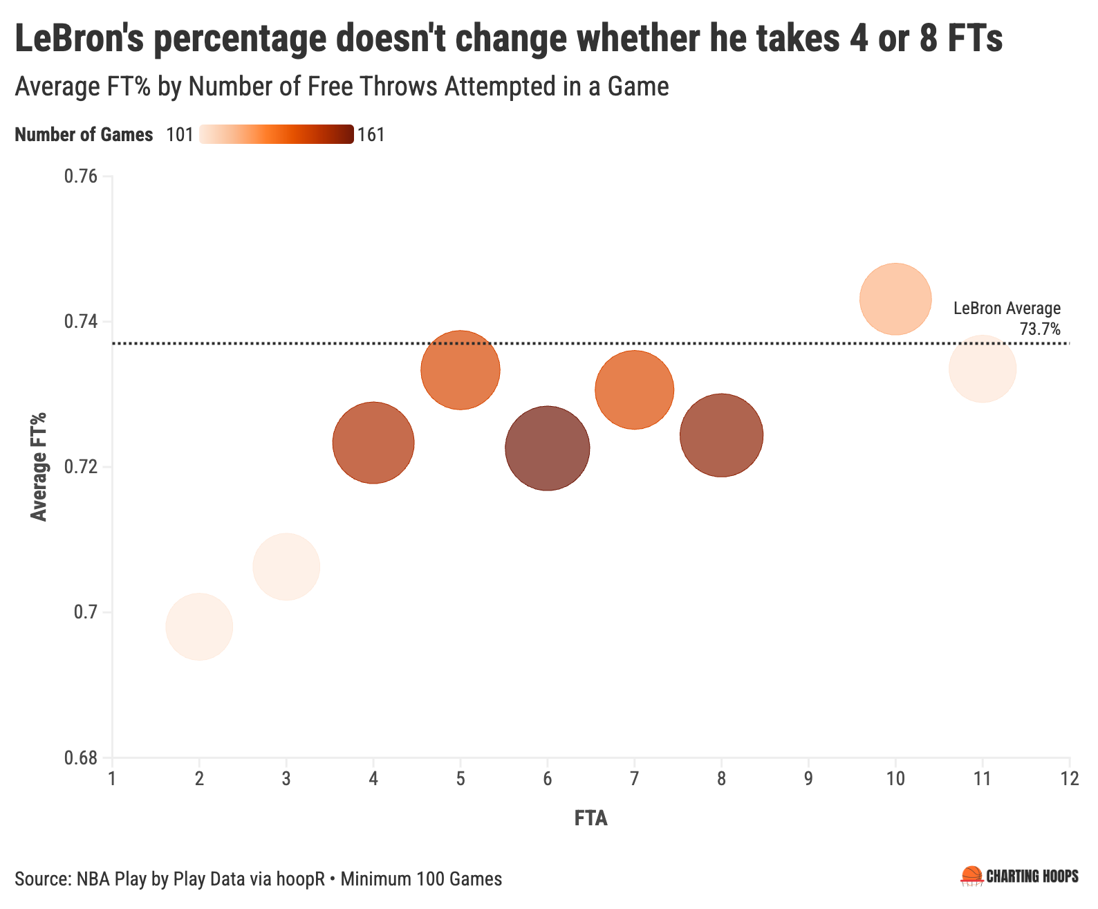 I also noted what makes a free throw unique, including that you usually get multiple attempts from the exact same spot over the course of the game and can take all the time you need to catch your breath before shooting, two things I ultimately concluded don’t help LeBron at the line.