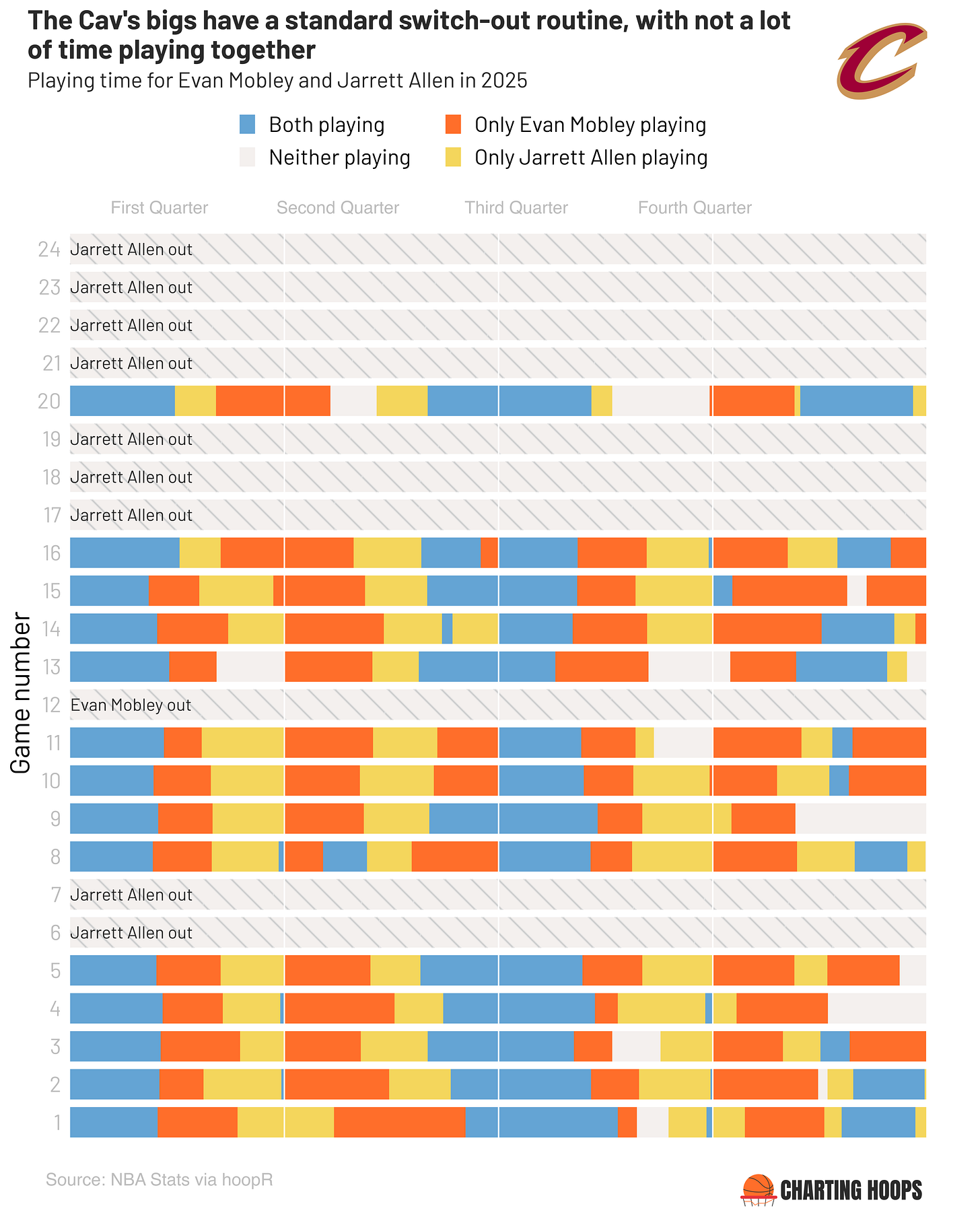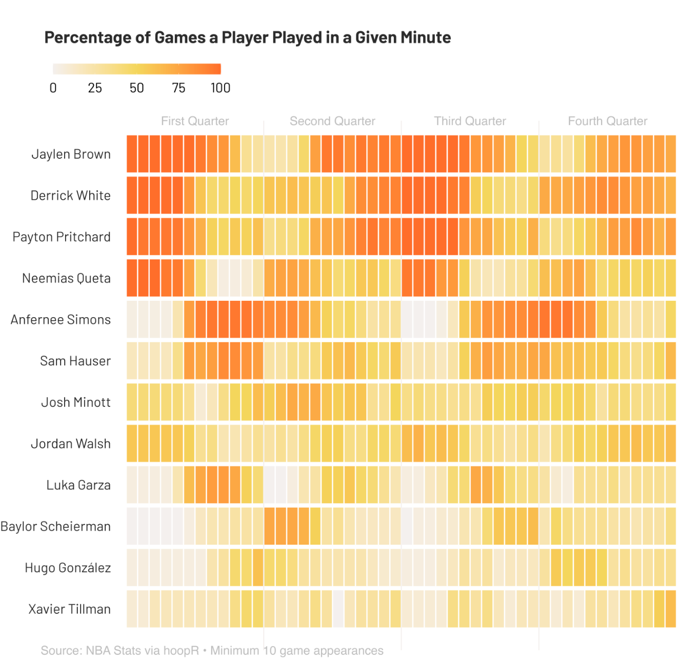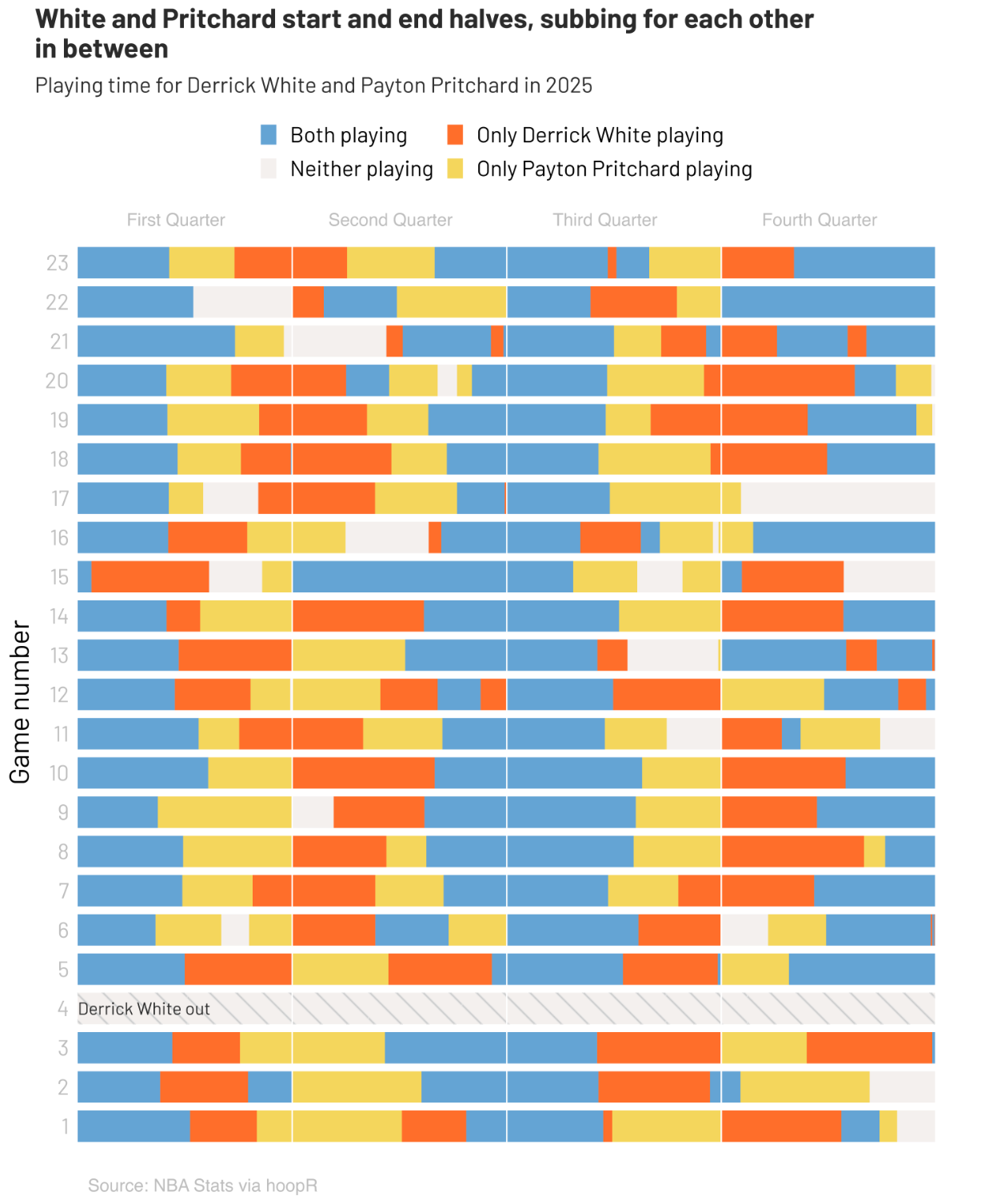 palette <- c( "Both playing" = "#64a4d4", # Note: You need to change the player names here manually!! "Only Derrick White playing" = "#ff6e2a", "Only Payton Pritchard playing" = "#f4d65c", "Neither playing" = "#f4f0ee", "Player Out" = "#f4f0ee" ) names(palette) <- c( "Both playing", paste("Only", current_player1, "playing"), paste("Only", current_player2, "playing"), "Neither playing", "Player Out")Format the “Player out” bars (grey stripes with a note).