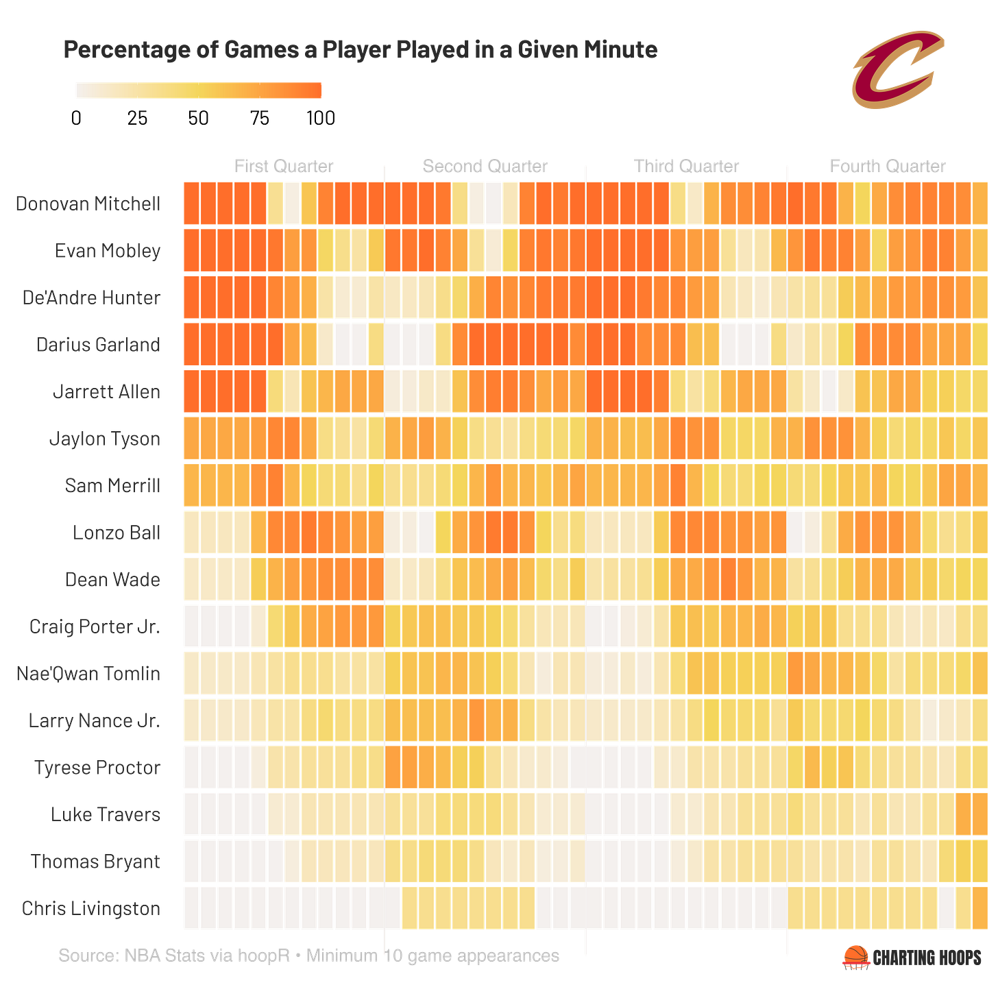 team_abr = map_chr(player_id, ~ paste(id_to_team[.x])))Before plotting, we need to filter for our selected team’s players once more since we’ve only filtered for games so far, and obviously there is an opponent in every game whose players are currently included. We can also filter out the players who don’t play often enough for our taste if wanted.