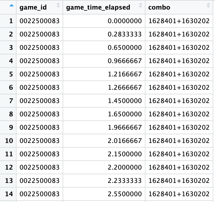 That’s it for now; I’ll leave it as an exercise for the reader to extend this to 3-player combinations. I’d love to know what other player combos you explore, or how else you apply this code. Make sure to check back next week to see what I find interesting in the Western Conference lineup patterns.