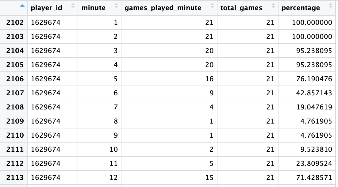 summarize(total_games = n())Then we merge those two datasets so we can see, at the same time, the number of games a player has played in a given minute and the total number of games a player has played, and ultimately calculate the percentage to use in the heatmap.