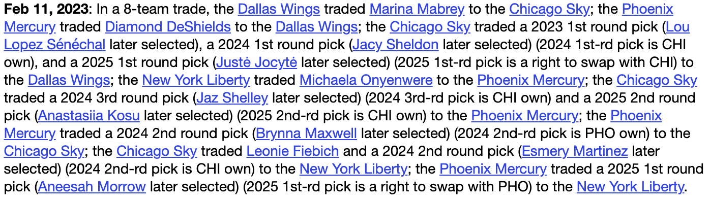 Prior to 2023, no team had ever traded away more than five picks in a season. When teams do trade a lot of draft capital, it’s usually so they can load up on current talent and make a run in the playoffs. The 2015 Lynx, for instance, traded five picks and got back Sylvia Fowles, Asjha Jones, and won the title. The Sky dished out five in this single 2023 trade, plus a swap, and haven’t won a playoff game since. Oh, and they traded another four picks in 2024. Maybe the WNBA needs to adopt the NBA’s Stepien Rule to require league approval before this team can make any more trades.