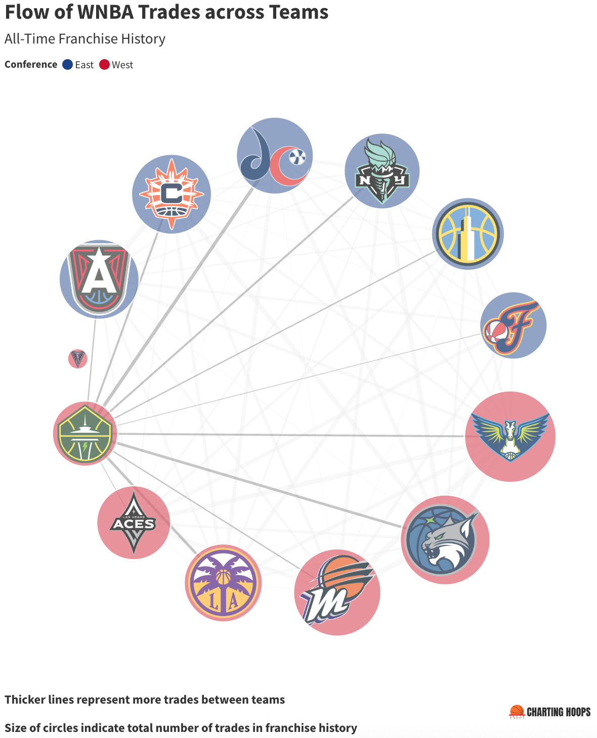 Almost all of the teams in the graphic above generally have bigger orange slices, indicating more of the trades were inter-conference.5 ATL is the one exception with more intra-conference trades and SEA, WAS, and LVA are close. Sometimes the trade just makes sense regardless of the source.