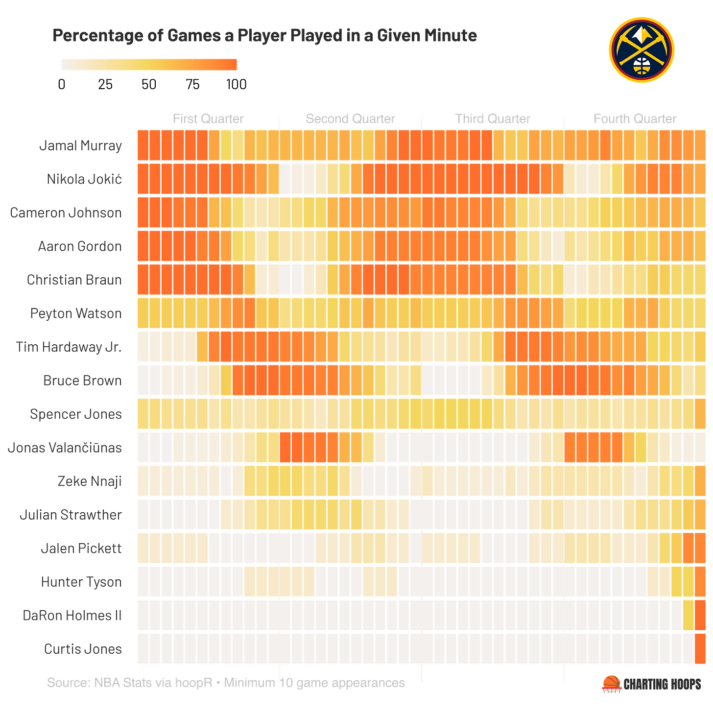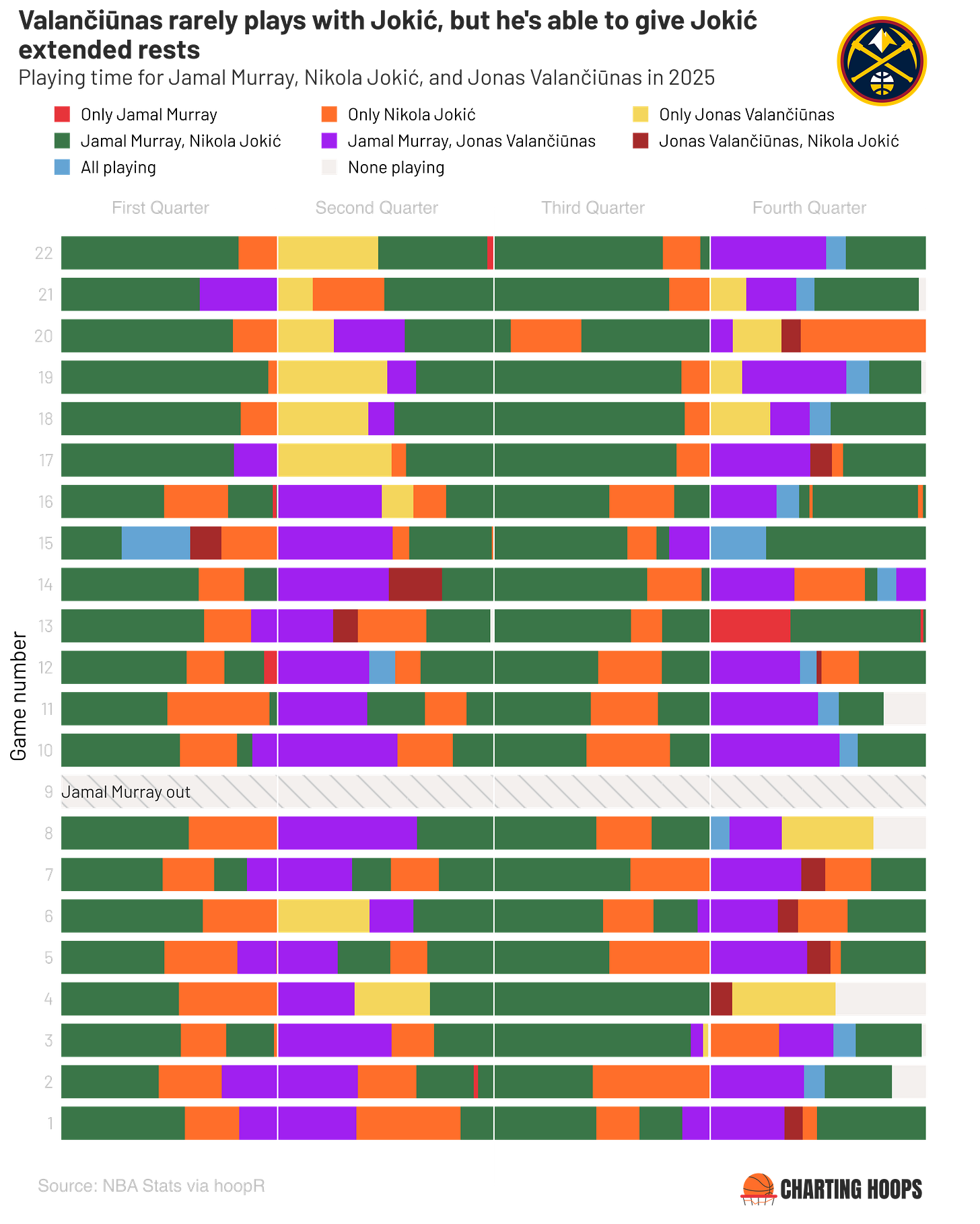 Jokić had one of the strictest substitution patterns last season, playing the entire first and third quarters, and I mean that almost literally. He played an average of 23.4 of the possible 24 minutes in those quarters a season ago. This year, Val is keeping the ship afloat in the oft-discussed “non-Jokić minutes”, allowing David Adelman to keep Jokić on the bench for longer (the yellow and purple in the chart below). This season, Jokić’s first and third quarter minutes are down to 22.8, which may not sound like much of a drop, but over the course of an 82 game season, that’s 48 fewer minutes, an entire regulation game.