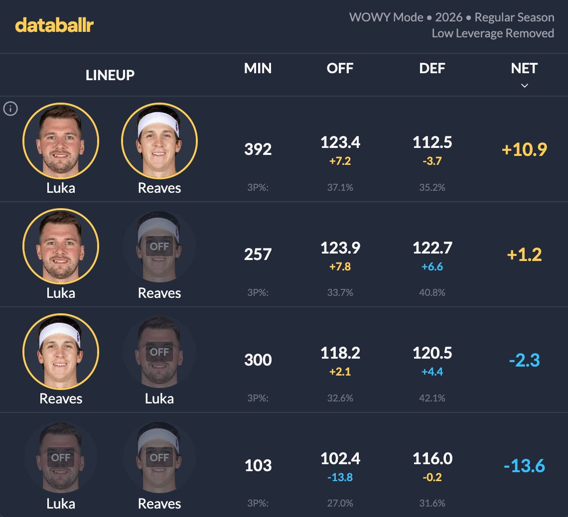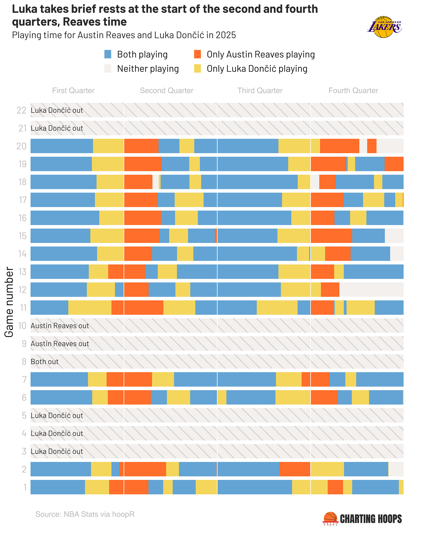 When Luka and Reaves are able to play together, JJ Redick gives them each time to shine. Eyeballing this chart, about half of Luka and Austin’s minutes are together while the other half are played without their friend.