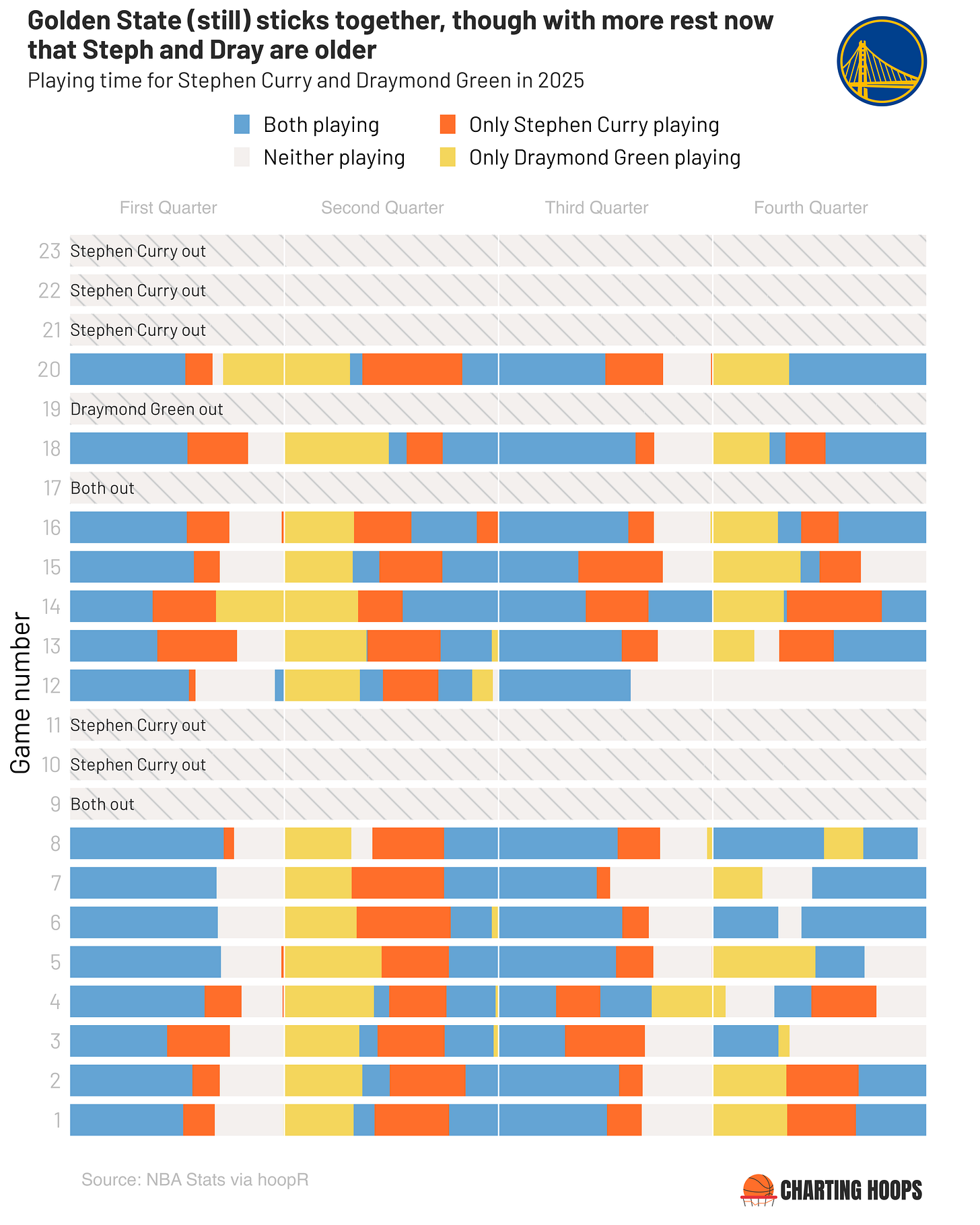 This whole series of lineup patterns, and the visualizations specifically, were inspired by a 538 (RIP) article by Jared Dubin and Julia Wolfe from 2021. That season (which Klay missed with his ACL tear), Curry and Green played almost exclusively with one another.