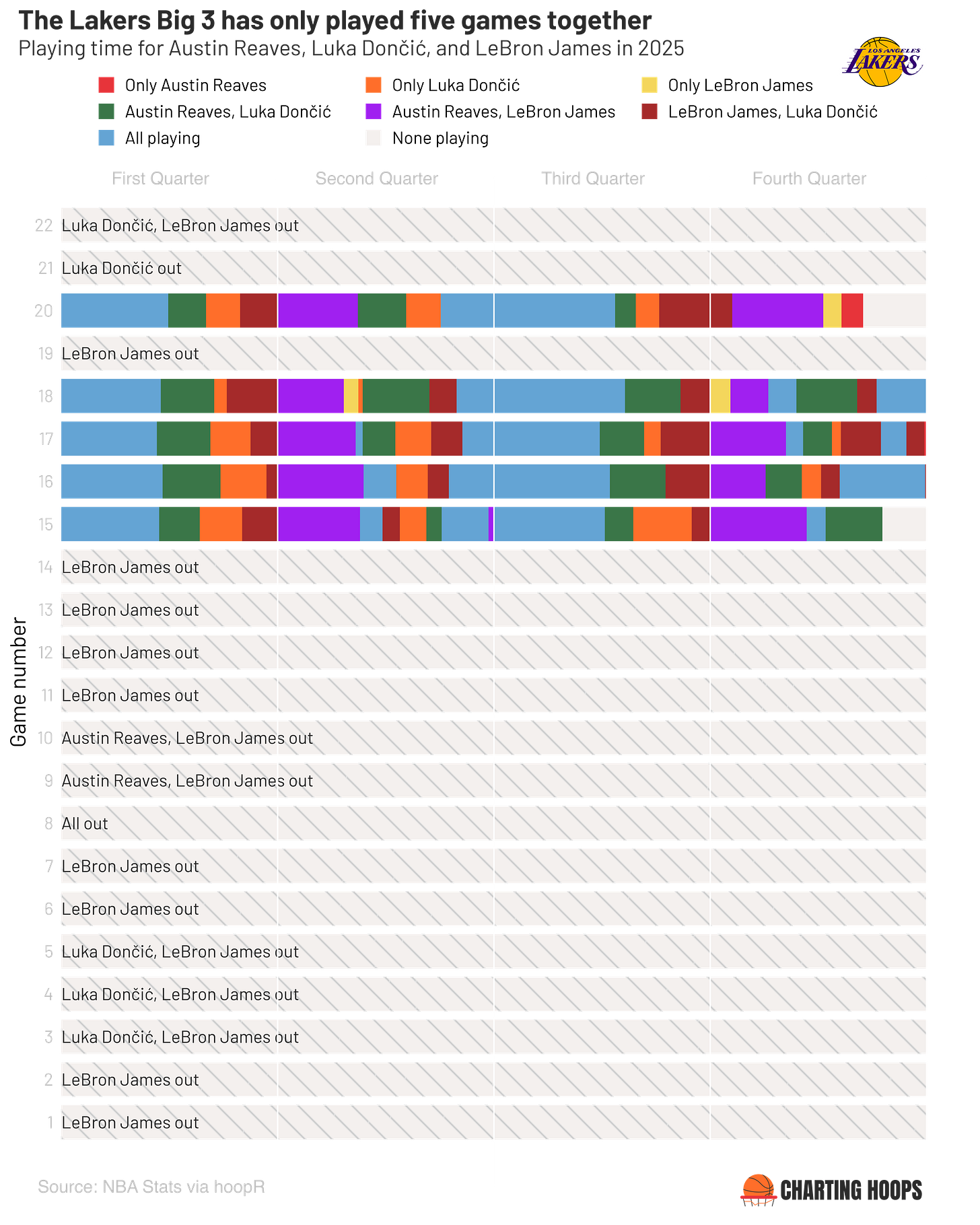 The Clippers’ cross-town rivals, the Los Angeles Lakers, have been dealing with even more injuries to their stars. LeBron missed the first 14 games of the season with sciatica, while Luka Dončić and Austin Reaves have missed another 8 early season games, making their overlap chart a little sad.