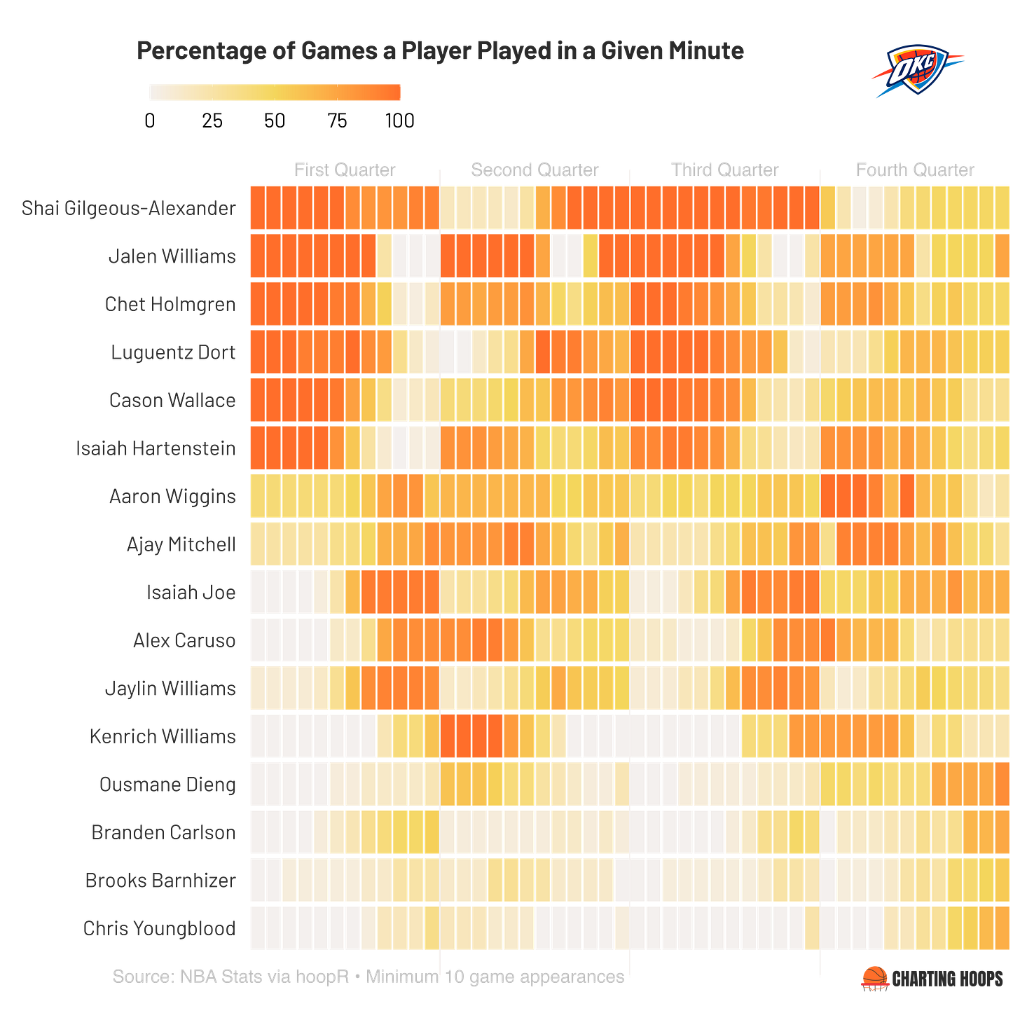 This also gives the Thunder’s younger (relatively, they’re all young!) bench players more experience on the court, valuable development minutes which will make this team even scarier in the future. Ajay Mitchell has gotten a lot of the spotlight, and is one of the favorites for Sixth Player of the Year, but a number of other guys - including Aaron Wiggins, Isaiah Joe, Jaylin Williams, Kenrich Williams, and even Ousmane Dieng and Branden Carlson are getting minutes. 14 different Thunder players average 10 or more minutes per game.