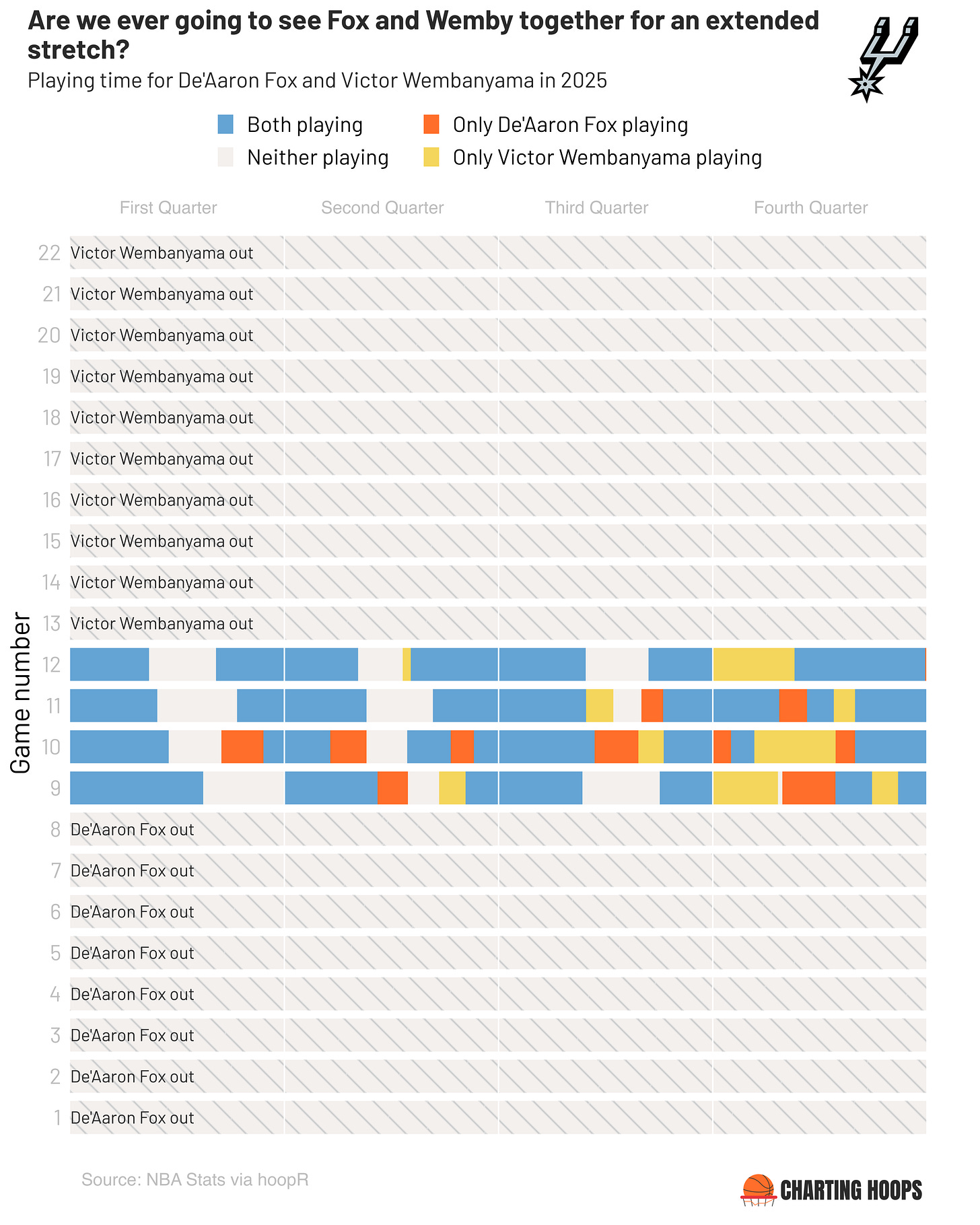 Meanwhile, at the time of writing, Victor Wembanyama and De’Aaron Fox had played just four games together this season, as both have sustained serious injuries. That comes after playing together just four games last year as well, before Wemby’s season-ending deep vein thrombosis diagnosis.6 When they do both suit up, they play almost entirely together. It will be interesting (and scary for the rest of the league) to see how this pairing develops with more and more minutes.
