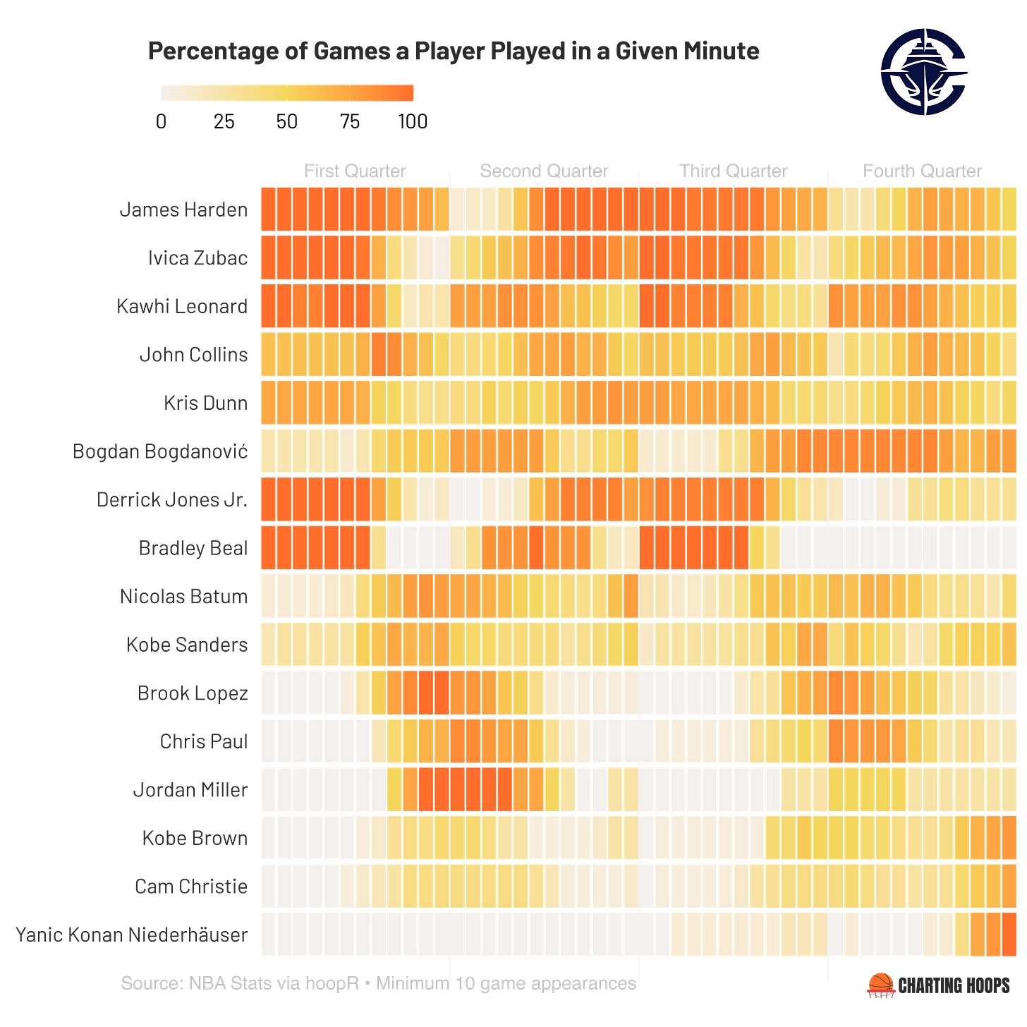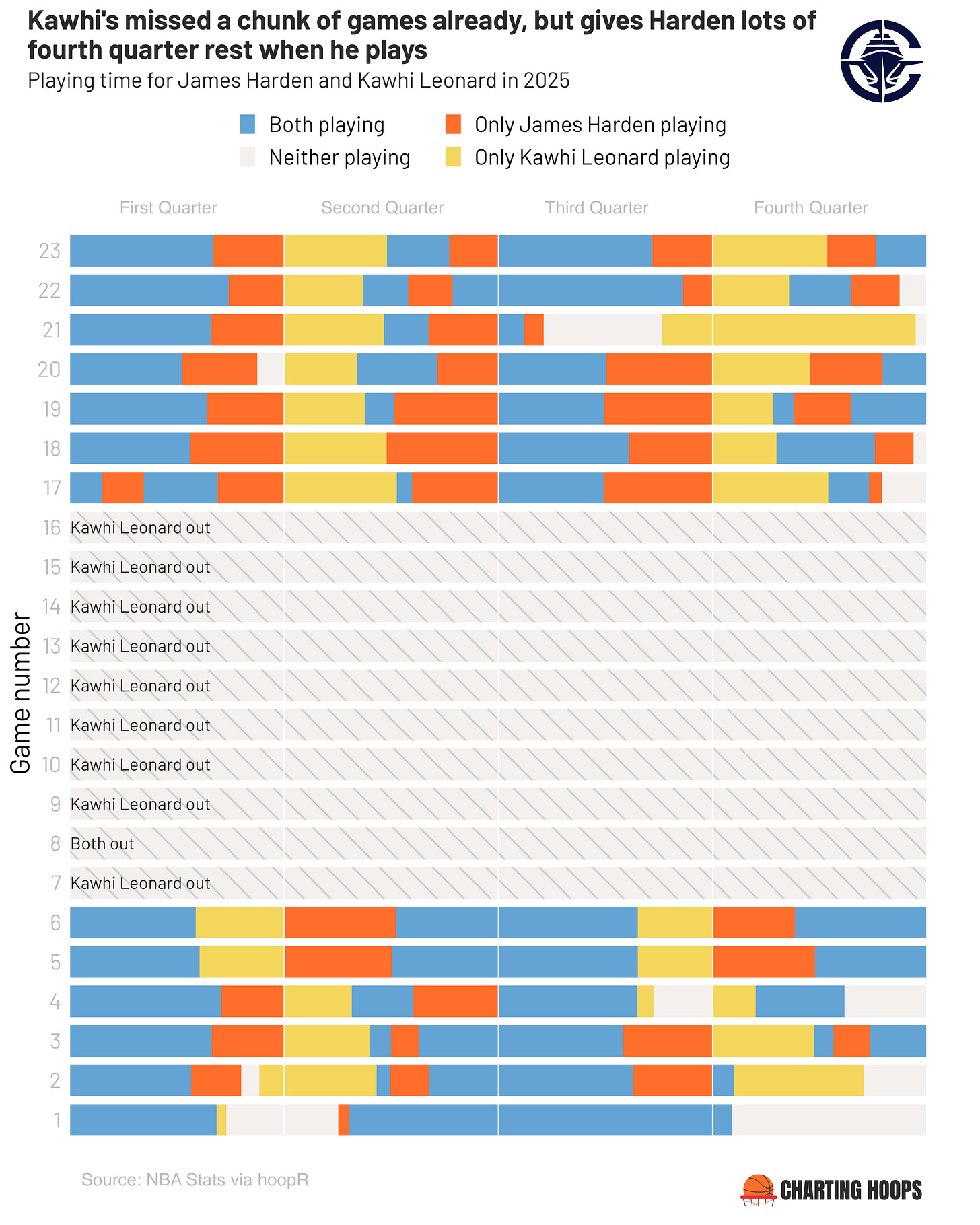 When Kawhi does play, he’s able to give James Harden extended rests, notably at the start of fourth quarters (yellow below). Unfortunately for the 36-year-old James, who is averaging the seventh most minutes in the league despite being a decade older than anyone playing more,4 that’s not often. Kawhi has already missed 10 of his team’s first 23 games.