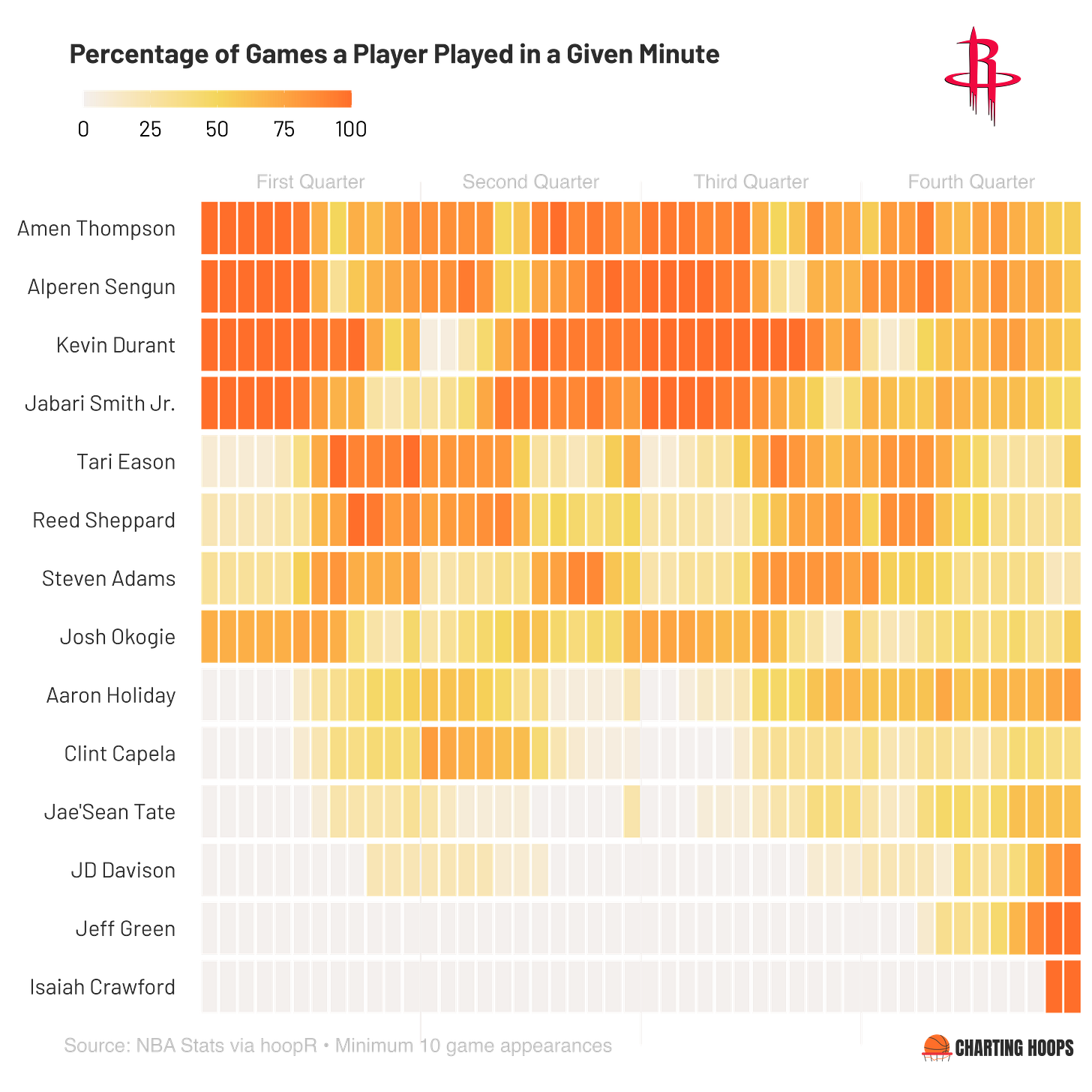 Let’s close out7 with the one other team that may stand a chance against the Thunder, the Houston Rockets. They have a pretty established pattern for their top-eight rotation guys, with Thompson, Şengün, Durant, Smith Jr, and Okogie starting then Tari Eason, Reed Sheppard, and Steven Adams providing shooting, more shooting, and Kiwi muscle off the bench.