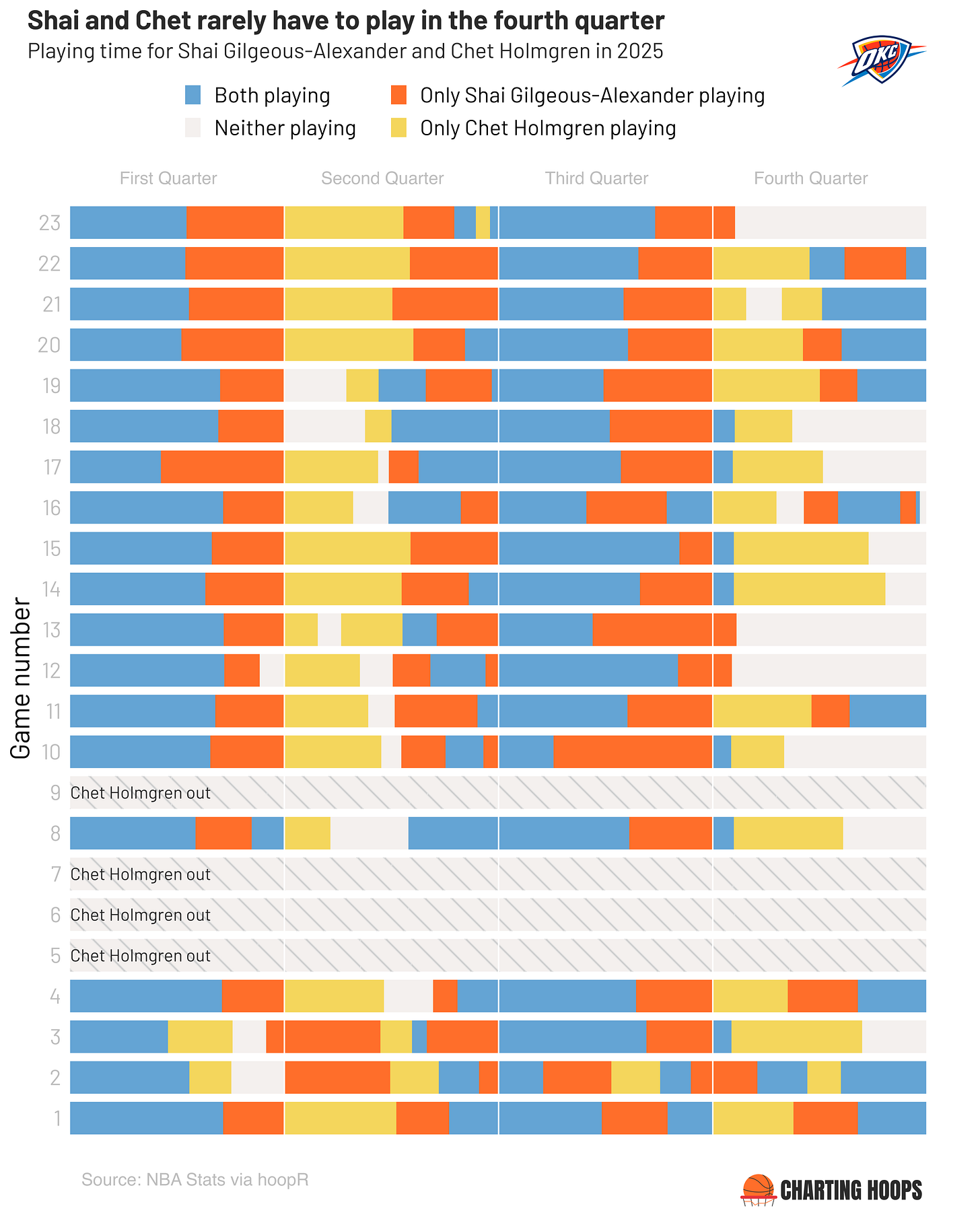 As a result, by the time a Thunder game reaches the fourth quarter, the margin is already 15 on average, and their stars - namely Shai Gilgeous-Alexander, but also Chet Holmgren to an extent - barely have to play in the final frame. Before the Thunder’s recent Cup Semi-Finals loss to the Spurs, Shai had only played in 11 of the Thunder’s 25 fourth quarters, averaging just over three minutes on the court in the fourth. Incredibly, he’s still the second leading scorer per game in the entire league, in basically a third of the possible time.