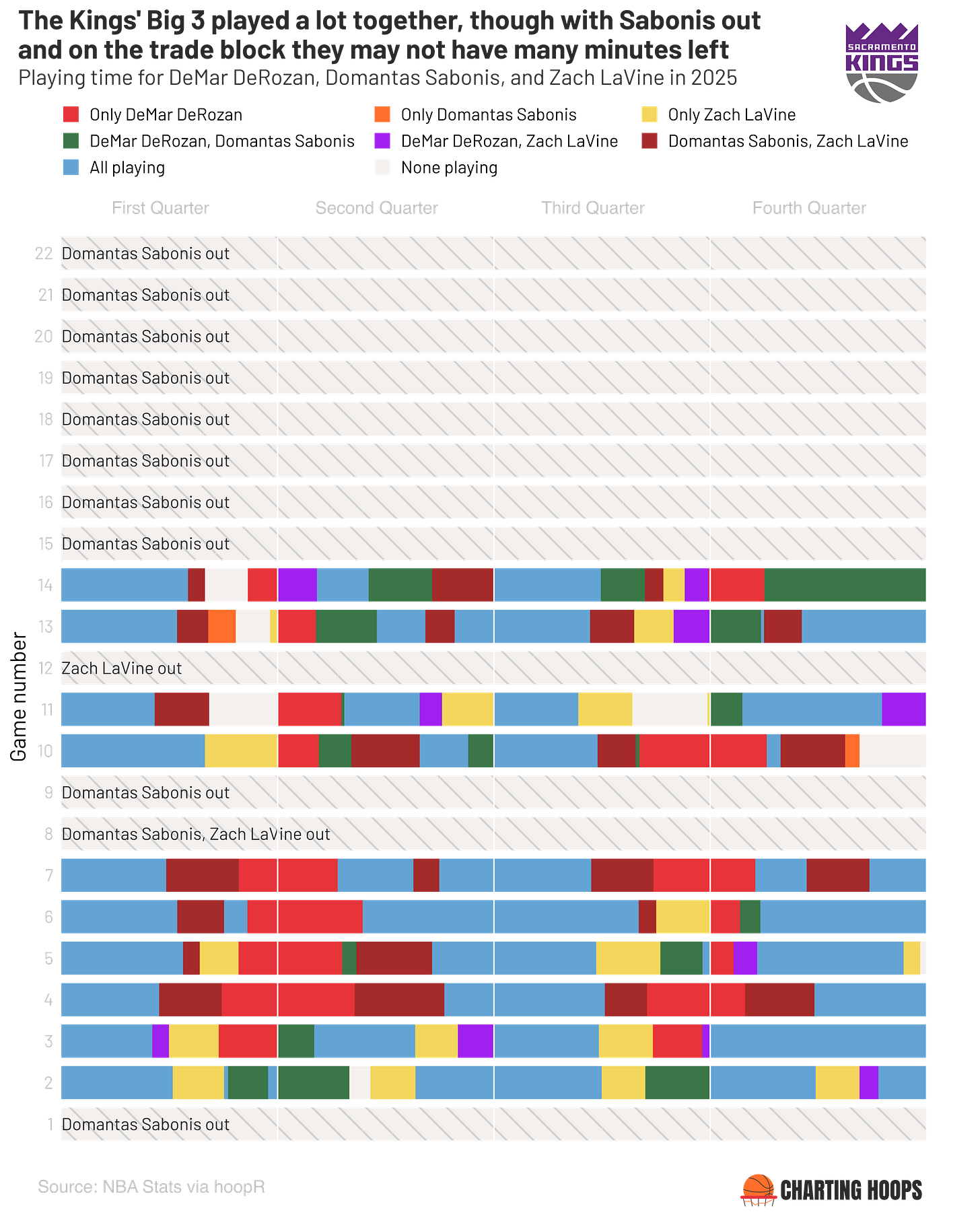 Domantas Sabonis has missed the last 12 Kings games with a partially torn meniscus in his left knee, and Zach LaVine has been out for a couple as well. The only interesting observation I have in these bars is a good chunk of DeMar DeRozan-only time in the first and second periods (bright red), and a sprinkling of LaVine-only time (yellow). With all three in trade rumors for the schedule-tanked Kings, we may not see many more minutes from these three together.