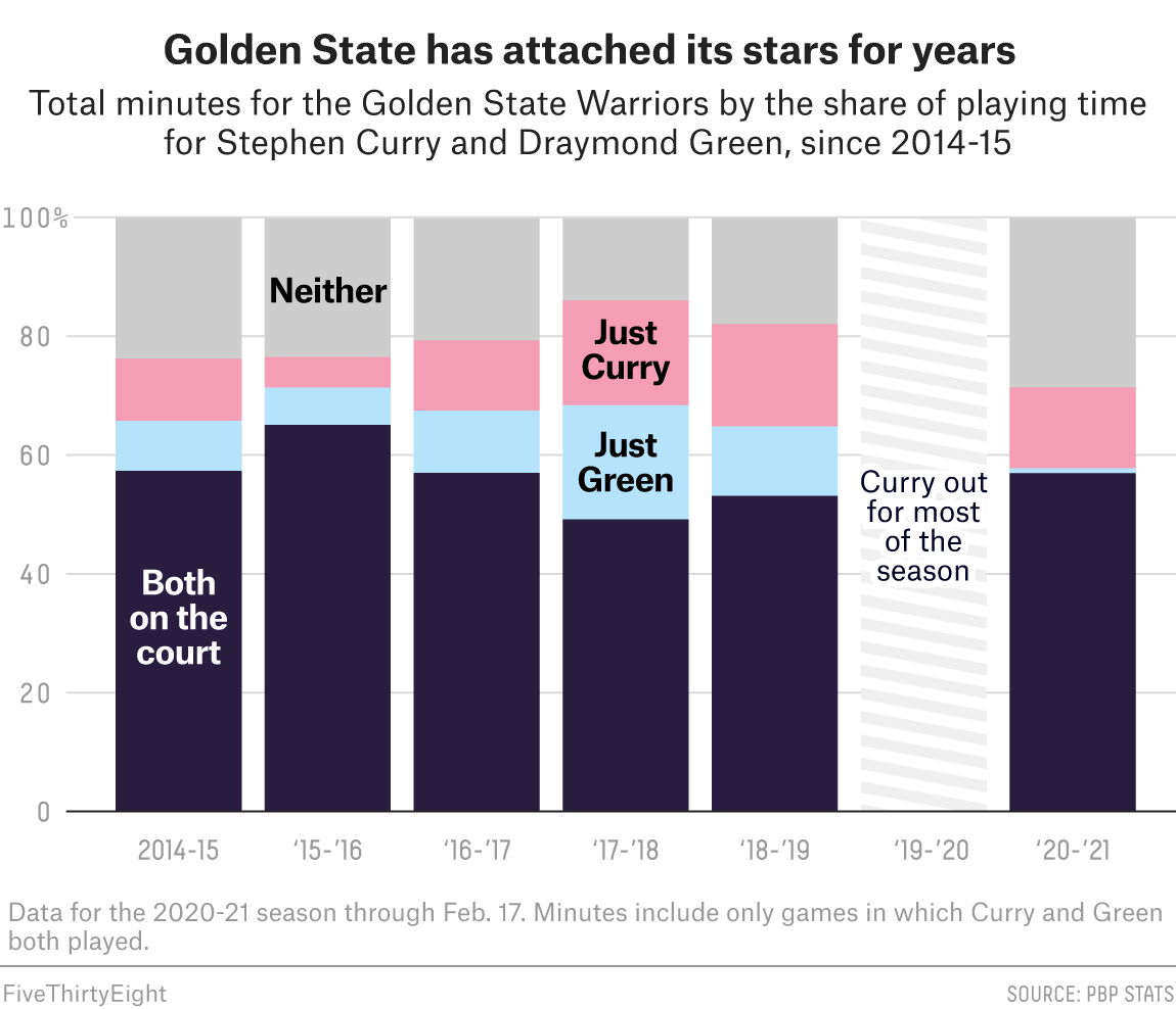 Aging, leading to reduced minutes and less opportunity for overlap. Both Curry and Green averaged three more minutes per game in 2020-21 vs 2025-26