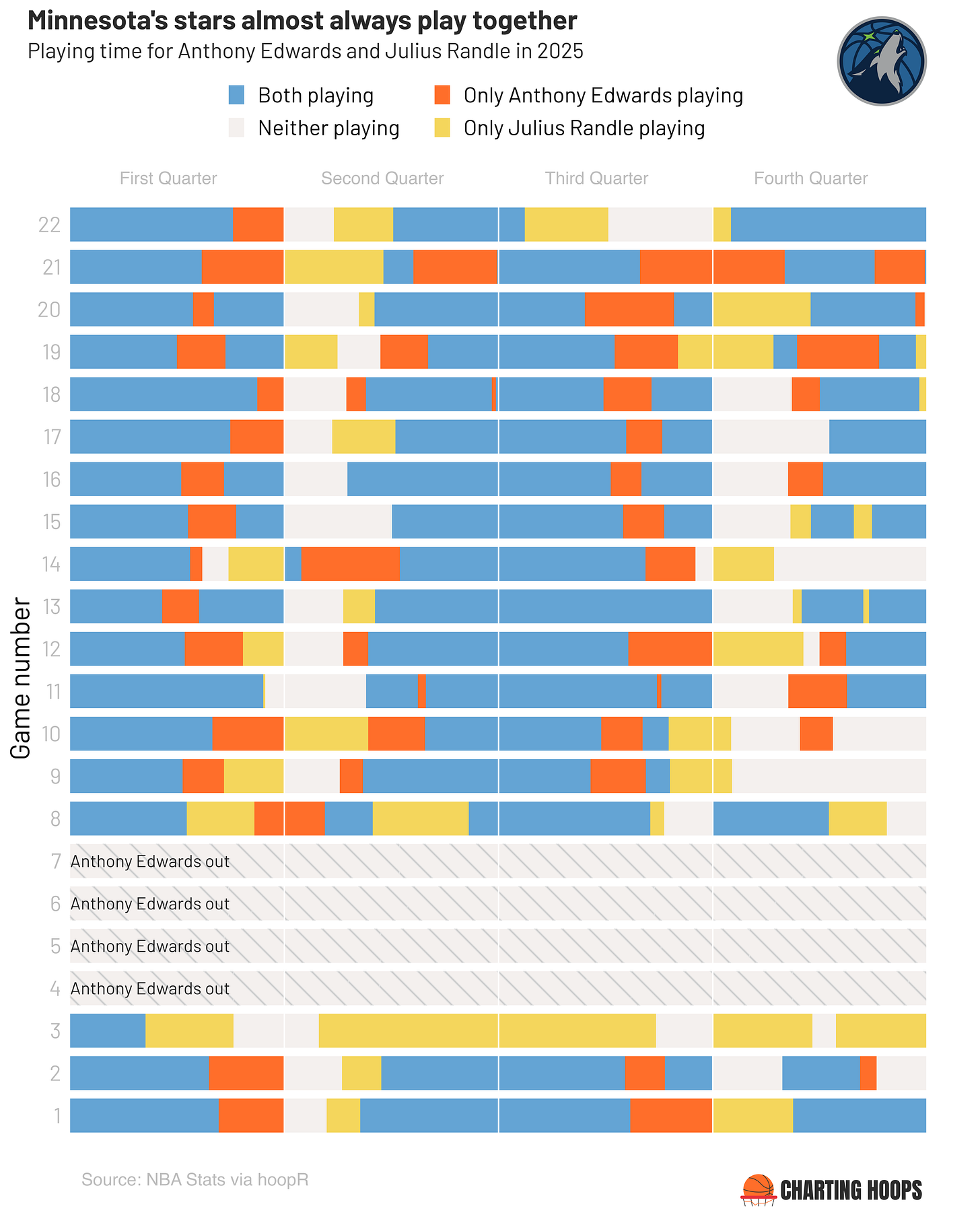Gobert is the other factor in Minnesota of course, and he’s the one who often stays on the court when Edwards and Randle are both off of it. In fact, the Timberwolves have played just three total minutes all season without any one of these three.3