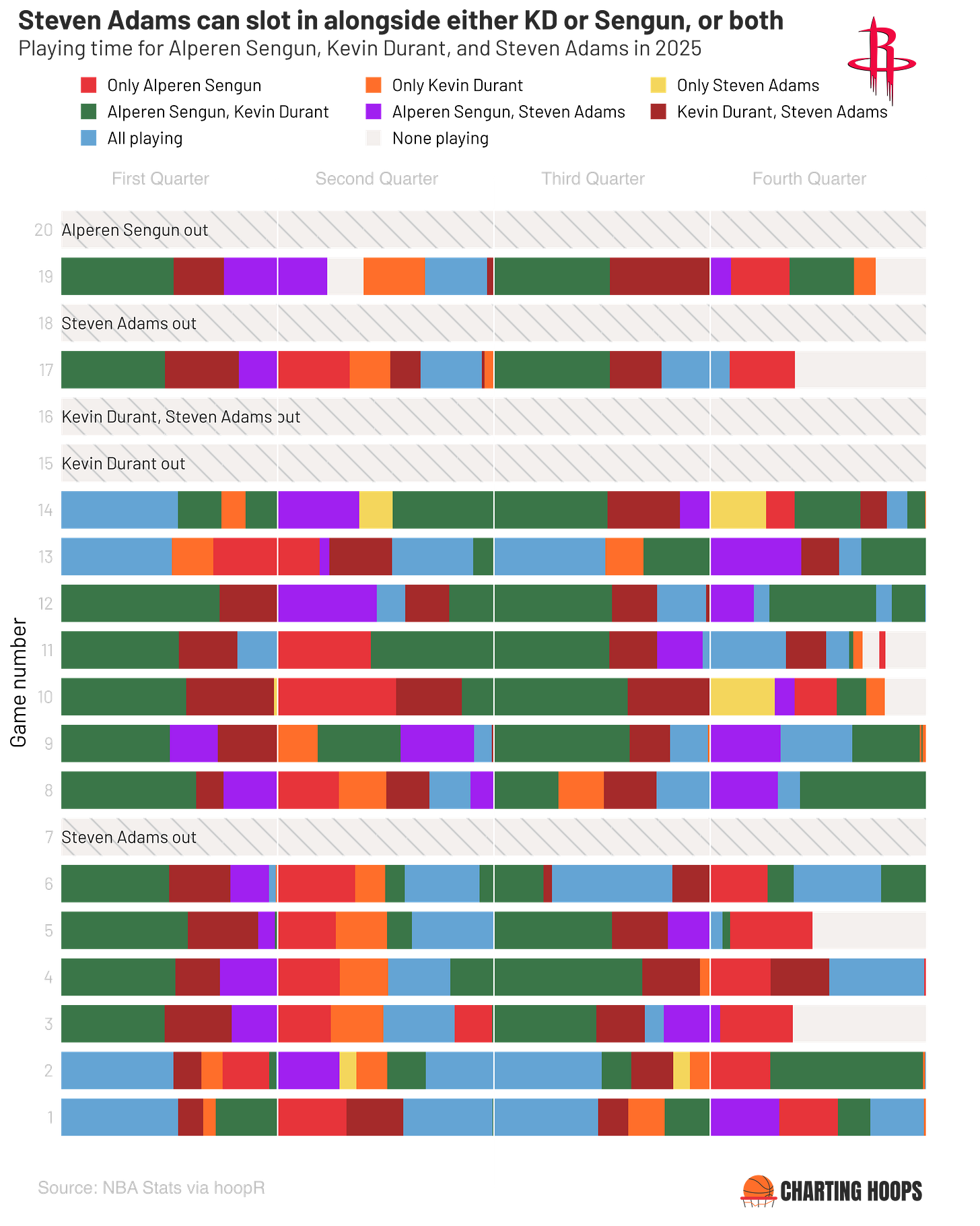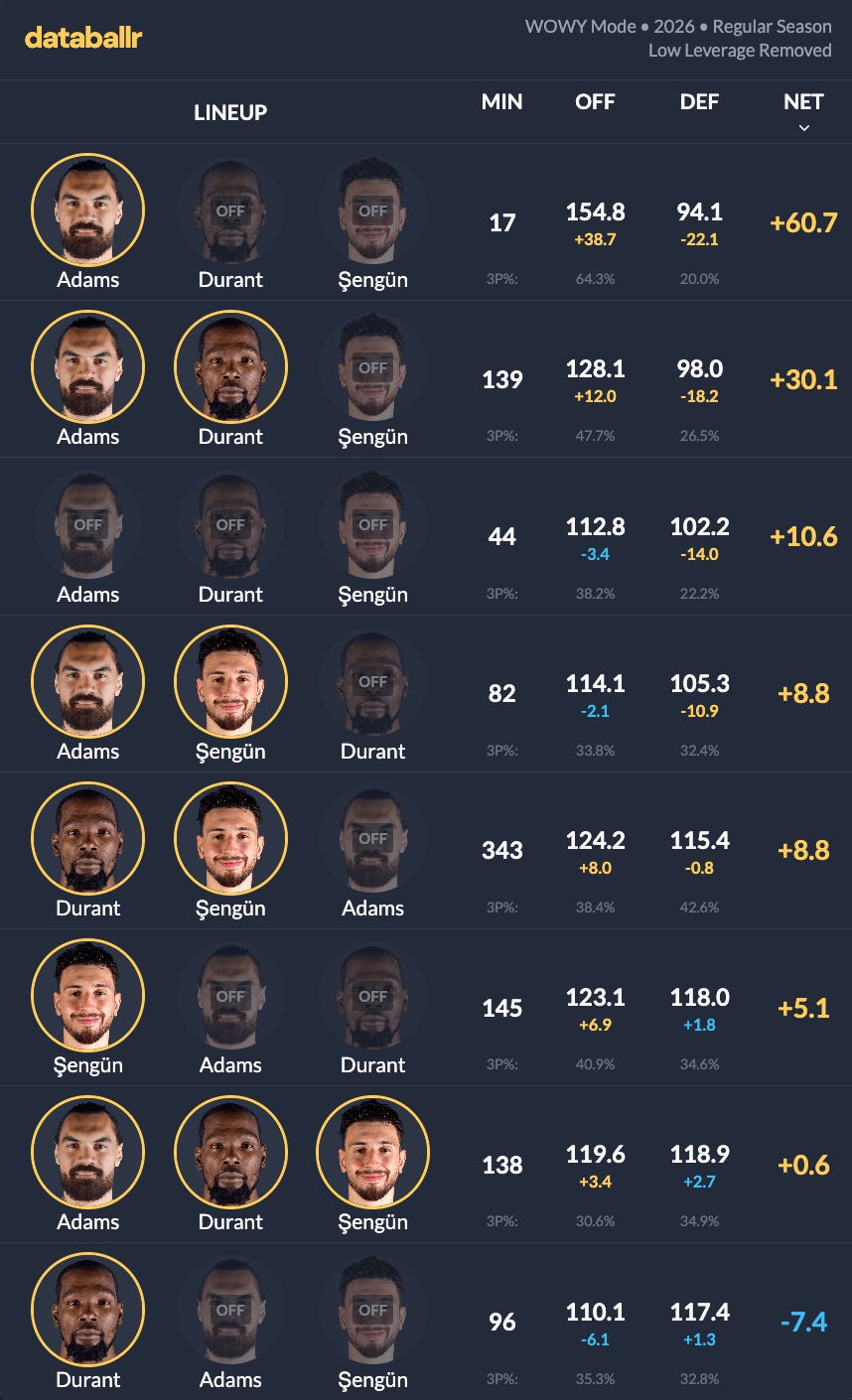 Kevin Durant is probably the best pure scorer the game has ever seen, Alperen Şengün is developing into an elite passing hub in the image of Nikola Jokić, and Steven Adams is the best offensive rebounder of his generation. The three play together in every combination possible, though not often all together.