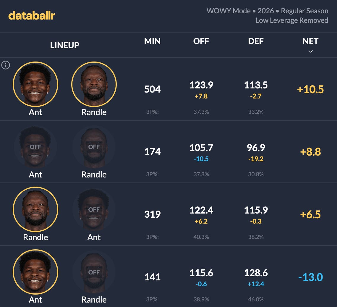 Edwards seems to need Randle’s calming presence out there: when they play together, they are equivalent to the second best lineup in the NBA, but when Ant-Man plays without his Luis the Timberwolves post a -13 net rating.