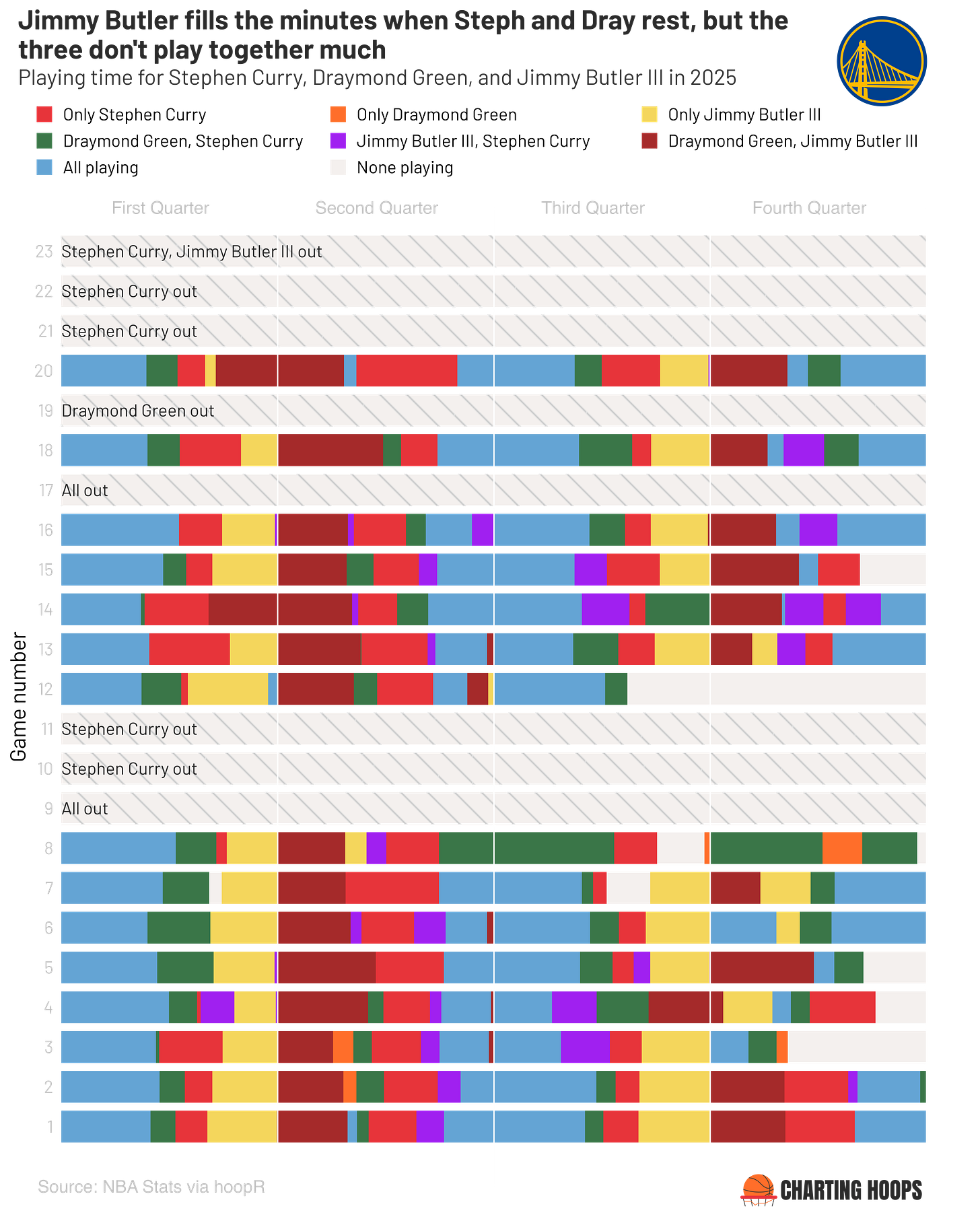 The addition of a third star in Jimmy Butler, whose averaging 31 minutes per game and provides the older Warriors more rest (the yellow in the chart below)