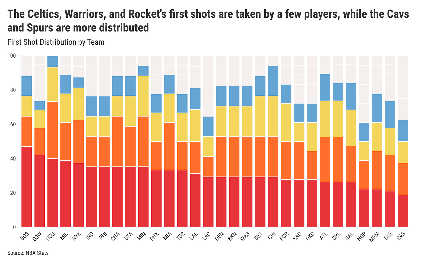 As you can see in the chart above, Houston’s first shot takers are even more concentrated than either the Warriors or the Celtics. That checks out, given the lack of shooting down their roster; as Zach Lowe likes to (jokingly?) point out, they may be the first real contender in NBA history whose primary offensive strategy is missing shots and grabbing offensive rebounds. Kevin Durant is the leading opening shot taker in Houston, followed closely by Alperen Şengün. Combined they take about 70% of the Rocket’s first attempts.