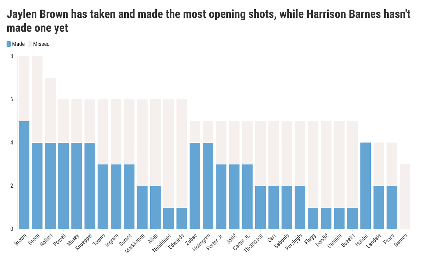 Across the league, Draymond Green takes the second highest percentage of his team’s opening attempts, trailing only Jaylen Brown in Boston. That concentration is more to be expected. While the Celtics still have flamethrowers in Derrick White, Payton Pritchard, and Sam Hauser on their roster, with Jayson Tatum out everyone knew this was going to be Brown’s team. Sure enough, he’s taking nearly four more shots per game than he did last season, and 0.5 more in the opening minute.