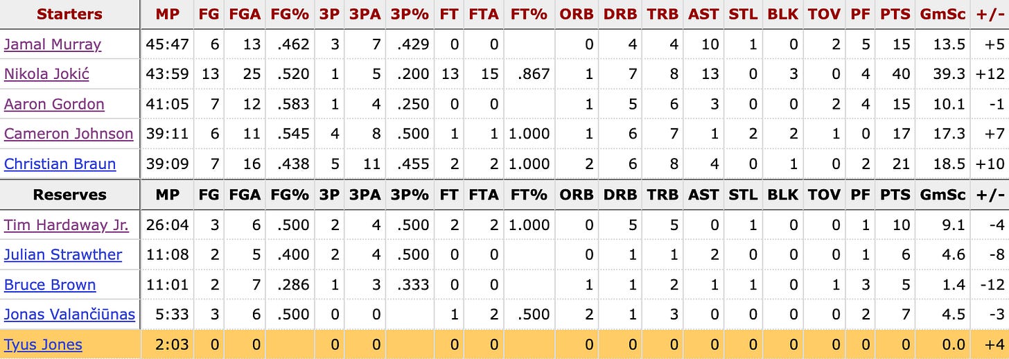 This one isn’t unexpected - the guy is averaging 28 points, 13 rebounds, and 11 assists on the season for goodness sake - but I was surprised to see Jokić ended up with a 40-piece by the time the game wrapped. It was one of the quietest 40-point, Belgrade-doubles9 I’ve ever seen.