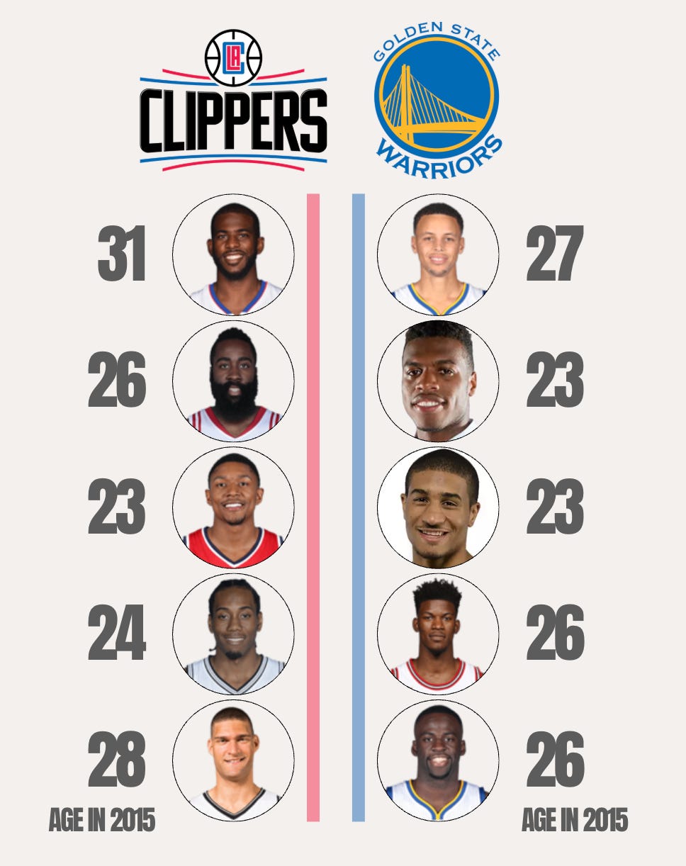 Well if age is just a number, then we can subtract 10 from it. Here’s what the Clippers starting 5 might look like after that mathematical transformation: